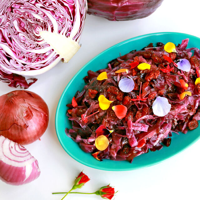 花びら舞い散るヴィーガンなサラダデリ。紫キャベツやクランベリーのビビットカラーがお腹やお肌にGOOD。