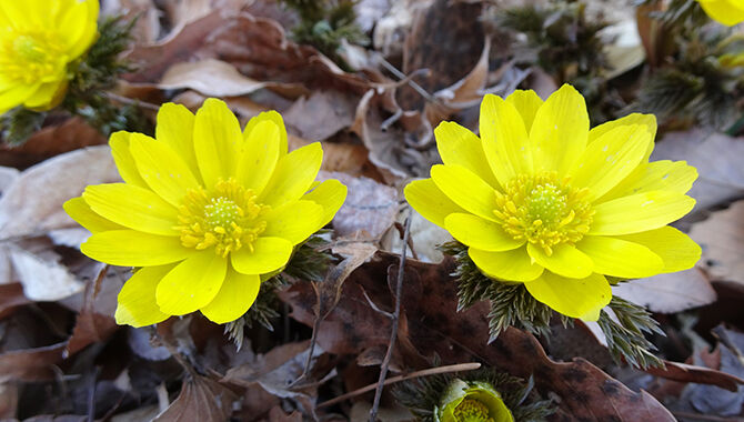 三峰北側山麓、蝋梅・節分草・福寿草などの草花の宝庫。鮮やかな黄色い花を咲かせている福寿草をお楽しみください。(撮影:nyata-mamaさん)