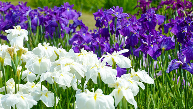 四季折々の花が咲き乱れる花の楽園、6月になると20万本の花菖蒲が楽しめます♪白と紫の花が一面に並ぶ姿は圧巻です!(撮影:E-ちゃんさん)