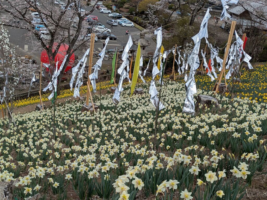 水仙フェア(13日まで)で入園料(買い物券200円込みで500円)を支払い見学です。水仙の開花が遅かったので延長になったとか?山の斜面には黄色やクリーム色の水仙が所狭しと咲いて、周りの桜のピンクと春色のコラボが良い感じです。雷のイメージの飾りがありにぎやかな景色ですね。19日からは花木センター3大イベントの一つの花と緑のフェスタが始まります。ルピナスの丘も早くも咲き始めて準備OKのようです。 (訪問:2025/04/09)