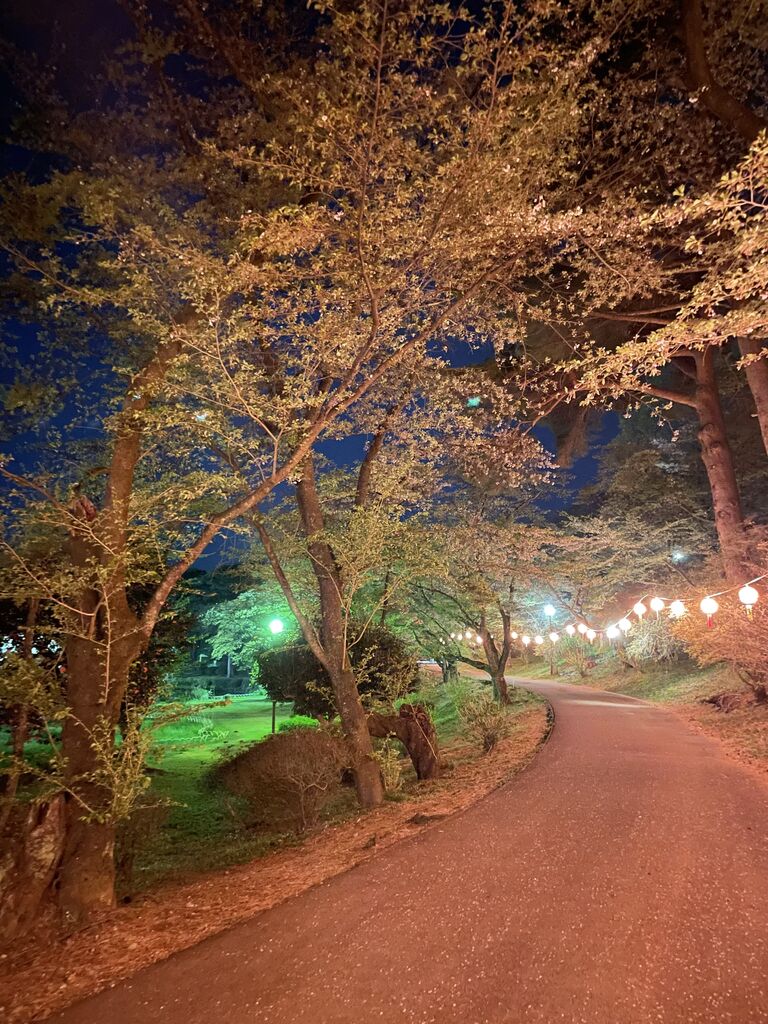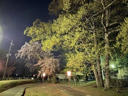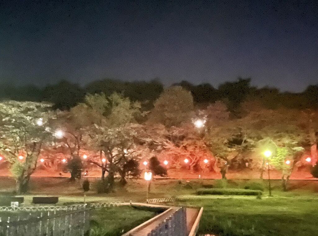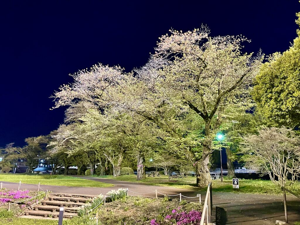 ここの夜桜は満開で見頃でした。中央の運動場様なライトが点いていて、夜桜がライトに映えますね。幻想的な風景。特に、西側の桜並木はソメイヨシノと枝垂れ桜が混ざっていて映えますね。芝桜も咲いてます^_^、 (訪問:2026/04/16)