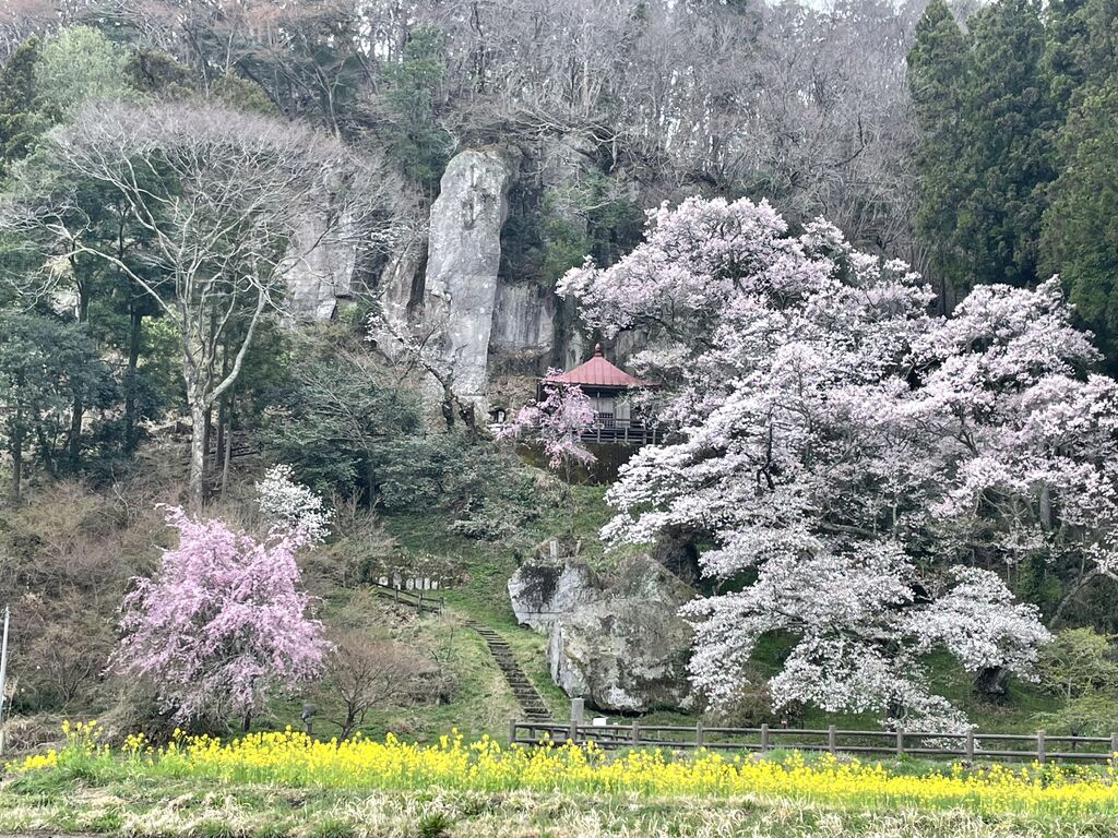 NEW岩観音の斜面の桜と手前の菜の花。どちらも満開で、明るい色のコントラストが見頃です。岩の上のお宮のから下を眺めても美しいです。遠くに御殿山の桜も楽しめます^_^ (訪問:2026/04/07)