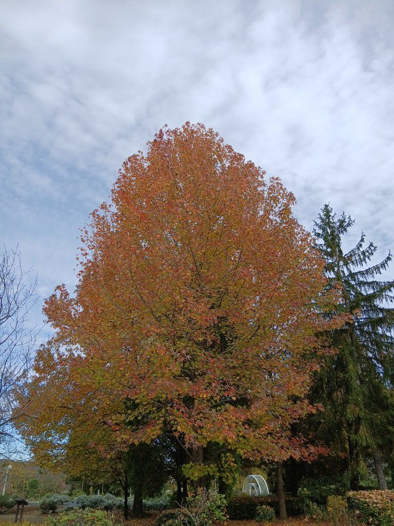 今日は、いつもの散歩コースで、西口駐車場から万葉庭園まで、歩いて来ました。歩いていても、顔にあたる風は冷たく、落ち葉の塊が大きく、もうそこまで冬が来ているようです。でも、万葉庭園では、この時期に咲く桜が1本あり、枝にはポツポツと花が咲いていたり、ツワブキが咲いていたりしていました。ハーブ園では、メキシカンセージが咲いていたり、モミジバフウという木が色づいて、散歩していてもとても気持ち良かったです。まだ、しばらくは散歩も楽しめます。 (訪問:2025/11/11)