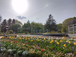 掲載:2026/04/16東側にメインの公園入口があり、そこから入るとぼってりとした八重桜が出迎えてくれました(✿︎╹︎◡︎╹︎)何とか枝垂れ桜が咲いてくれて噴水とのコラボが叶いました✨園内は、マーガレット、ツツジ、オオアマナ(ベツレヘムの星)、矢車草など前回の花々からすっかりバトンタッチされてました(^^) (訪問:2026/04/12)