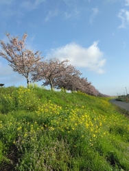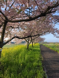 小山市内を南北に流れる“思川“の堤防には各所に“思川桜”が植えられていますが、今回は間々田地区の“網戸(あじと)大橋”へ行ってみました。橋の上下流側の堤防には菜の花も咲いていて、ピンクと黄色の競演が見事です。このような光景は“新間中橋”など他の箇所でも見ることができます。この季節は堤防沿いの散歩やサイクリングが特にオススメです。 (訪問:2026/04/09)
