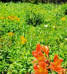 天気に恵まれた日曜にニッコウキスゲを見に出掛けました。駐車場は早くから満車のようで、かなり下の駐車場から歩いて登る方も多く見られました。金曜時点での開花状況を確認してから出掛けましたが、土曜も暑く天気が良かったせいか、一気に開花が進んでおり、500段より上の方まで見頃になっていました。お天気にもよりますが週明け来週は1番の見頃になるのではないでしょうか?1500段の階段は少々大変ですが、登るだけの価値はありますよ! (訪問:2025/06/29)