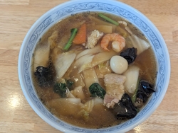 お店の前は車でよく通るのですが、また今度、次にしようとずっと先送りにして伺うことが出来ませんでした。この日は車の数も少なく感じて駐車場へ。お座敷、テーブル席は満席でしたがカウンターが空いていたので、直ぐに席に着くことが出来ました。私は【みちのくメン】と【餃子】を注文。しっかりとした醤油ベースのスープで具沢山のとろみの付いたあんかけラーメンです。細麺で大変美味しかったです。餃子は醤油で下味が付いているので、何もつけずに食べられます。勧められたお酢とラー油で食べても美味しかったです。ごちそうさまでした。