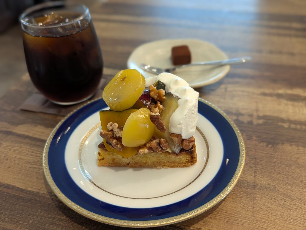 オリオン通りにあるお店です。店内を見るといつも席が埋まってる状態で、何度か諦めていたのですが、この日は空いている!という事で突撃しました。この日も暑い日でしたのでかき氷も考えましたが、美味しそうなケーキがショーケースに並んでいますので、ケーキとコーヒーにしてみました。【アメリカン珈琲】と季節限定の【季節のタルト】をチョイス。栗やかぼちゃなど4種類の旬の味覚が乗った贅沢なケーキです。カスタードクリームも甘さを抑えており主役の秋の味覚を際立たせる役を担っていました。クッキー生地とクルミの食感の変化も楽しめて幸せになるケーキでした。香ばしいアメリカンも飲みやすくてケーキとの相性も良かったと思います。サービスの生チョコも口の中でとろけてしまう美味しさでした。