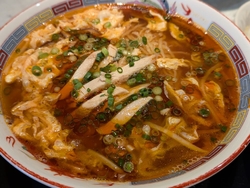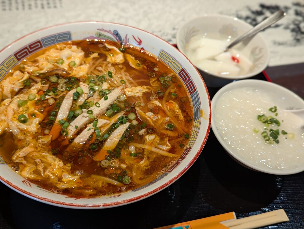 私が子供の頃からある中華料理店です。ランチを食べにお邪魔しました。ランチは4種類あり、ライスかおかゆが選べてドリンクor杏仁豆腐も付きます。【酸辣湯麵】をおかゆでお願いしました。辛くて酸っぱいのですが、溶き卵がマイルドにしてくれているので刺激はありますが、それほどの辛さは感じませんでした。酸っぱ辛いはクセになりますねぇ~。おかゆは絶妙な味付けがなされていて、とても美味しかったです。最後はさっぱりとした杏仁豆腐で美味しいランチを締めくくりました。ごちそうさまでした。