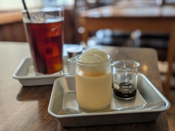 廃校になった小学校を利用したカフェで前から気になってはいたのですが、やっと訪問することが出来ました。ランチメニューの中から私は【ダブルサンドイッチ】を注文。期間限定のオレンジのフルーツサンドと熱々のパニーニのセットです。新鮮なオレンジとたっぴりの生クリームで食べ応えのあるフルーツサンドで美味しかったです。デザートはプリンを選びました。プリンの上にアイスが乗りエスプレッソをかけて食すアフォガードプリンで美味しいデザートでした。食後には校内を見て回り、ノスタルジックな雰囲気で遠い記憶が蘇ってきて懐かしさを感じました。
