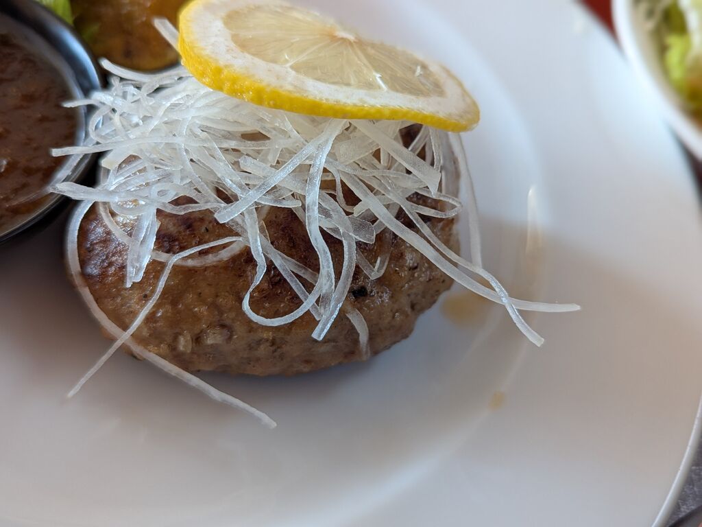 近くの床屋に散髪に来たのですが90分待ちでしたので、ランチを先に済ませてしまおうと思いお邪魔しました。週替わりの肉、魚のランチや創作丼などもありましたが、今日はハンバーグが食べたい気分でしたので【ハンバーグランチ】1500円を注文。まん丸ハンバーグはお箸を入れると肉汁が溢れ出してくるジューシーハンバーグでした。サラダもボリュームがありドレッシングも美味しかったです。テーブルの間に仕切りがあり、人の目を気にすることなくランチをいただけました。ごちそうさまでした。