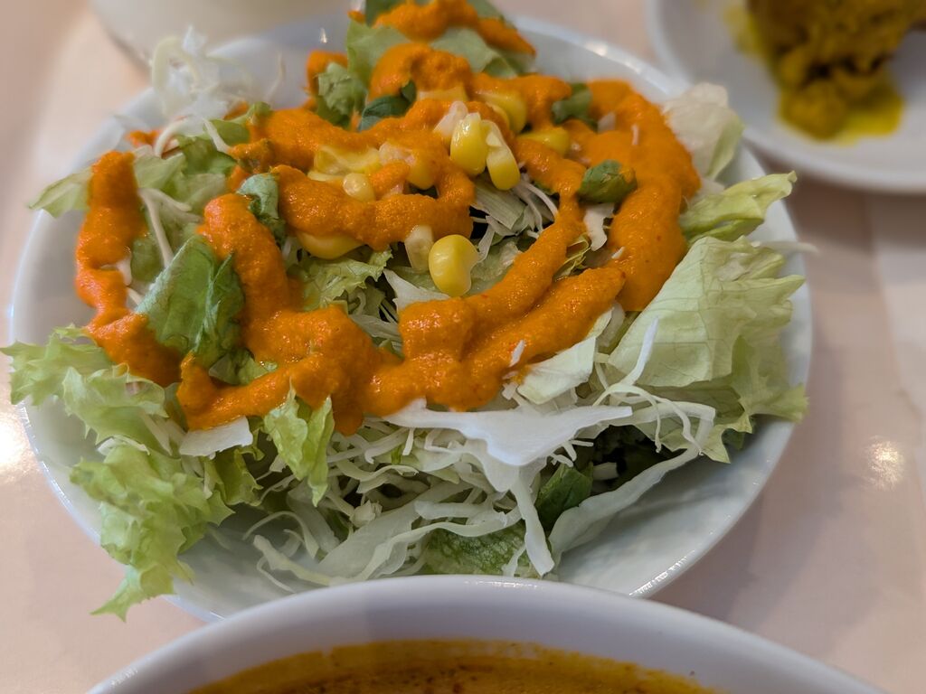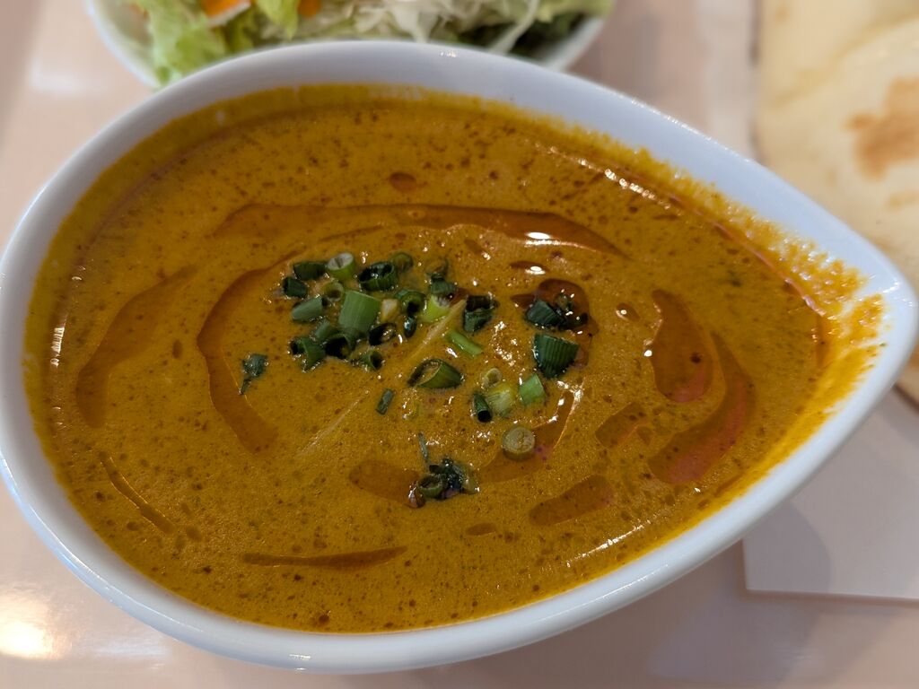 岡本の4号線沿いに山インドキッチンがオープンしましたのでランチを食べに行ってきました。店内は広くて一人でも気軽に入れる感じのお店です。私はAセットでカレーはチキンカレーに100円のラッシーを付けました。辛さは冒険をして中辛(笑)で。スープにサラダ、ローストチキンも付くので十分な量です。ナン、ライスもお替りできますからね。いつもカレーとナンのバランスが悪くてカレーが残ります。ナンでは量が多いのでライスのお替りで〆はカレーライスにして完食です。お腹いっぱいの満足ランチでした。ごちそうさまでした。