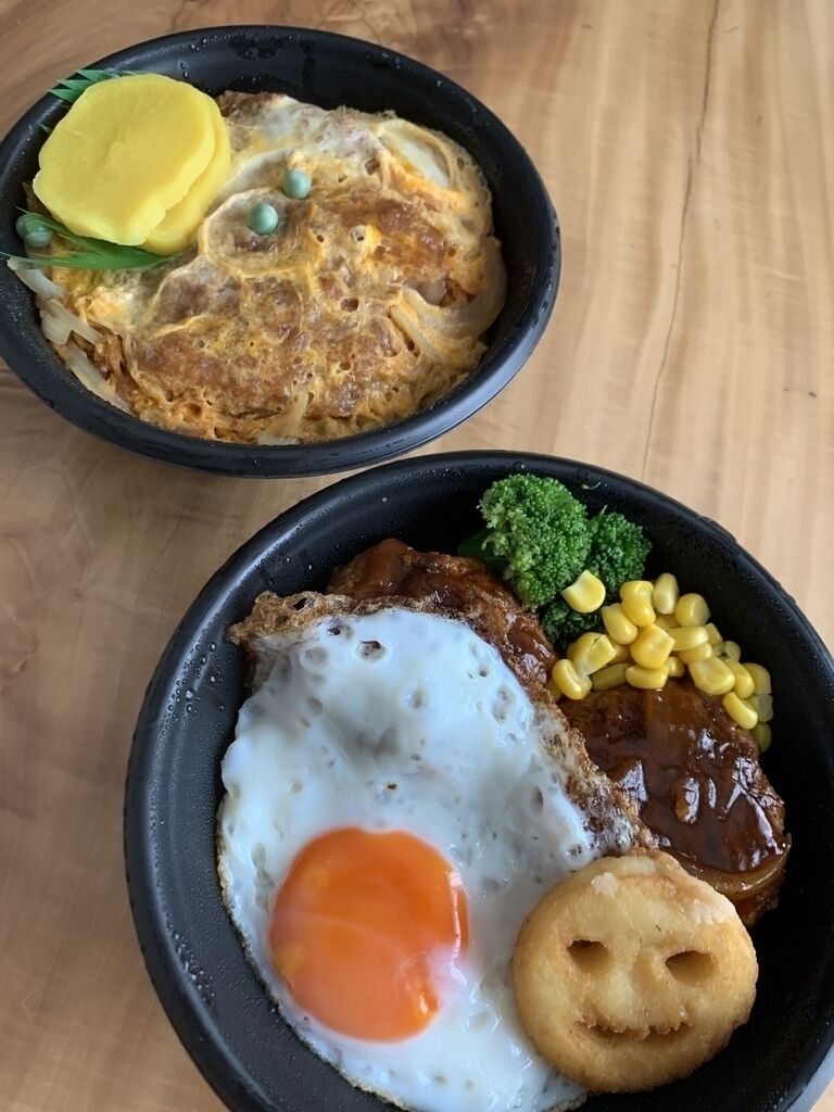 GW最終日、ランチにテイクアウトしました。当日の10時に電話をし、11時に伺いました。名物のカツ丼と、限定のニコニコ弁当。カツ丼は甘めのタレが食欲をそそり、カツも程よい厚さで卵でとじられているので、子どもも大人も大好きな味です。ニコニコ弁当は小ぶりのハンバーグが2個とプルプルの目玉焼きがのったロコモコ丼です。ジューシーなハンバーグと、トロトロの黄身がからまれば、ご飯が進みます!予約しておいたので、出来立てをテイクアウトできました。即席のみそ汁もついて助かりました。