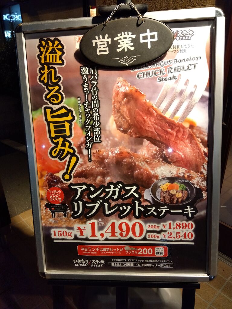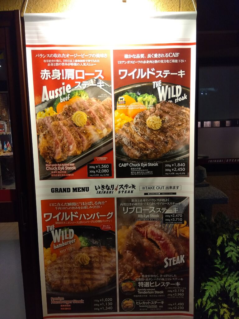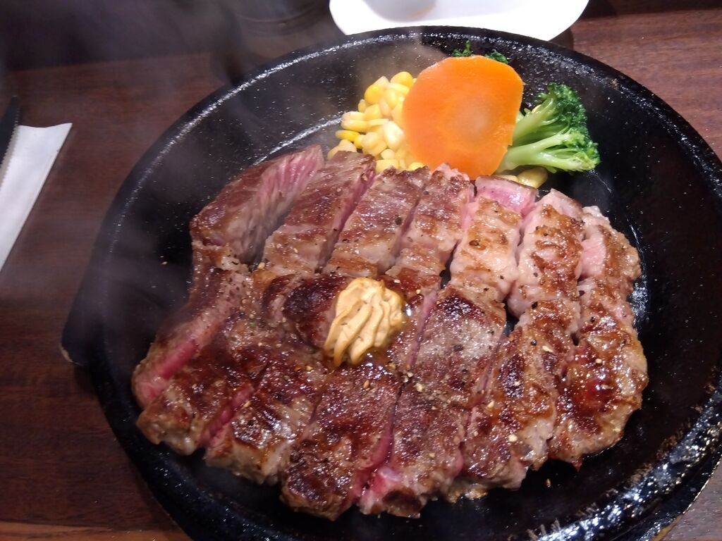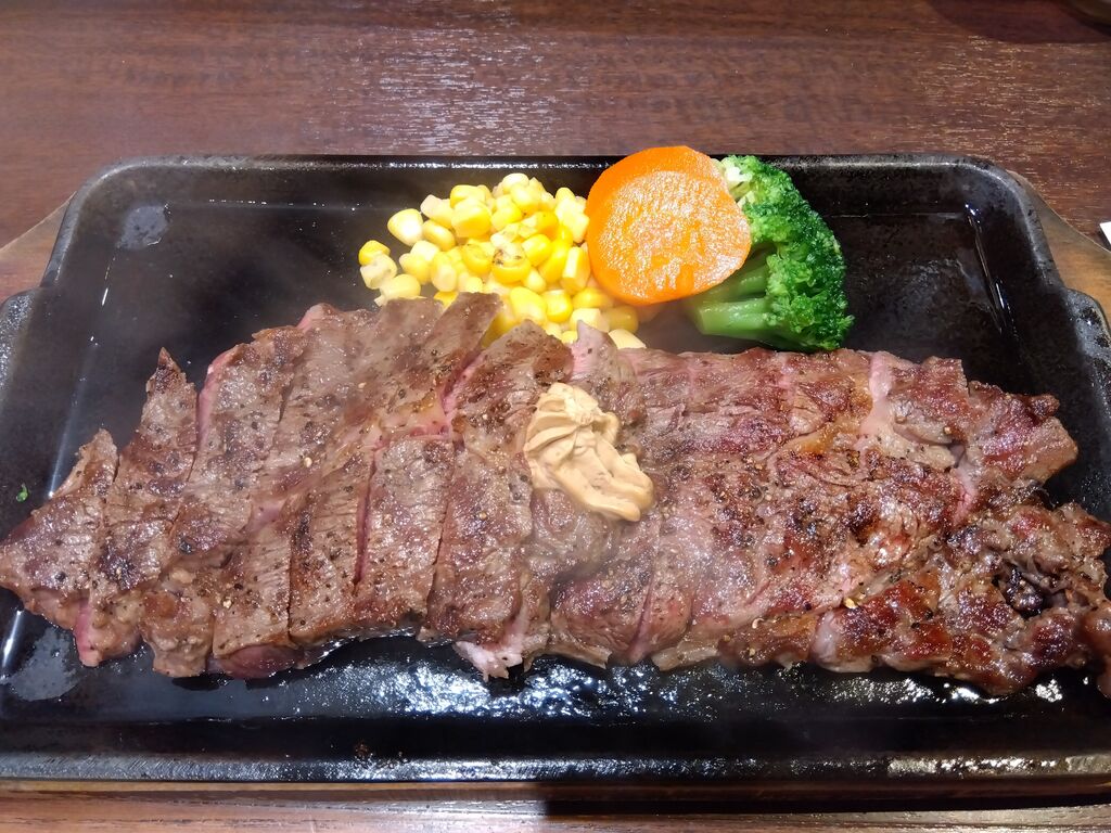 ちょっと久しぶりに早めの夕食におじゃましましたぁ(^∇^)ノ♪入口にどど〜んとある看板の「アンガスリブレットステーキ」?も気になりましたがやっぱりお気に入りの「赤身のロース」を300g〜☆赤身といっても程よく脂身もありGood〜(^^)bいろいろな調味料で味変しながら最後まで美味しくいただきましたぁ(^人^)♪柚子のソース&わさびといきなりオリジナルの甘口のタレ&ニンニクがお気に入りです♪相方はお馴染みの「ワイルドステーキ」を300gにライス&サラダセットを付けて、さらにアプリクーポンで¥150で生ビールをいただきましたぁ(≧▽≦)♪ワイルドステーキは脂身がしっかりで運ばれて来た時のジュウジュウはすごかったぁ〜w(°o°)wモリモリ食べて元気出ましたぁ(≧▽≦)!また元気チャージにおじゃまします♪