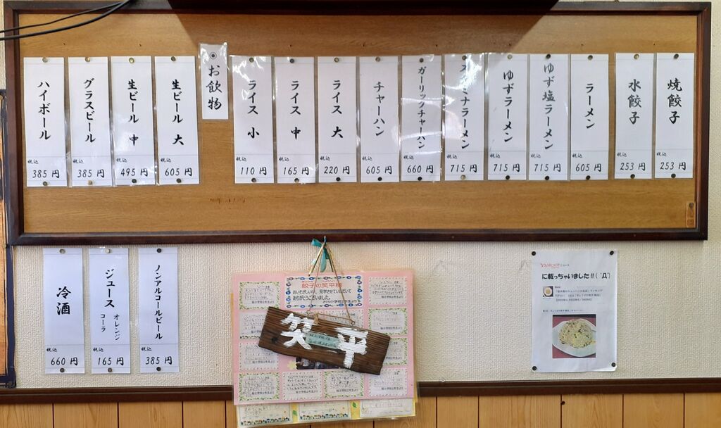 トライアルでの買い物の際、ランチで笑平さんに訪問。注文は焼き餃子(6個253円)とラーメン(605円)です。餃子は、外はパリッ、中はジュシーです。餡がしっかりと味が付いているので、何もつけなくても大変美味しい。またちょっと甘めの笑平さん特製タレをつけても大変美味しかったです。ラーメンは昔ながらの醤油ラーメンです。だしが効いたスープに細麺がとっても合います。餃子もラーメンもとっても美味しく値段もとてもリーズナブルです。開店後、10分も経たないうちに店内はほぼ満席となる人気のお店です。