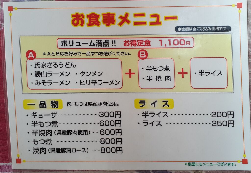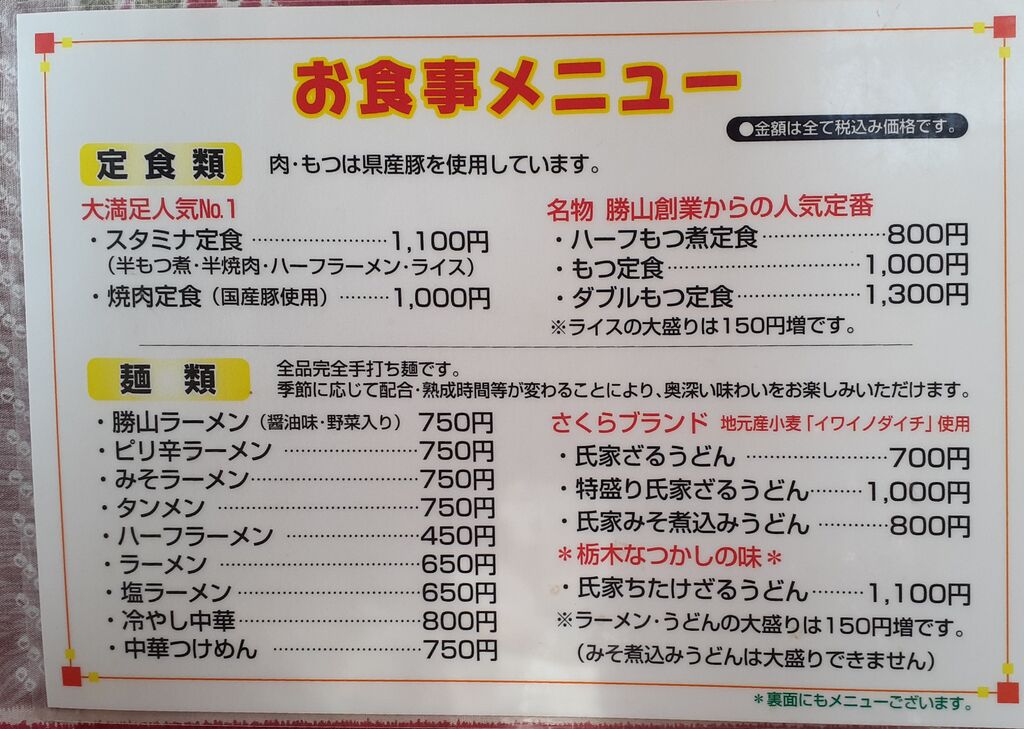 inoさん 宇都宮市 総合レベル59 ファン34 クチコミ 名物お食事処 勝山 さくら市/定食 47 36 お食事処 勝山さんにランチで訪問しました。注文はボリューム満点!!お得定食「タンメン+半もつ煮+半ライス」です。タンメンは野菜たっぷりで優しいスープと手打ちのもちもち麺が合い、大変美味しく食べ応えもあります。もつ煮ですが、とってもわらかく煮込まれてこれまた大変美味しいです。もつ煮をごはんにかけて食べるのもおすすめです。満腹お得定食は味、ボリュームとも大変満足でした。色々と組み合わせが出来るので、ぜひまた訪れてみたいです。おすすめのお食事処です。 訪問日:2026.02.23 クチコミタグ #ランチ #テイクアウト #デカ盛 #盛り付け◎ #お1人さま #家族 #ごちそう #びっくり #おいしい #また来たい "ぐッ"ときた! 11人 inoさんのクチコミ一覧に戻る