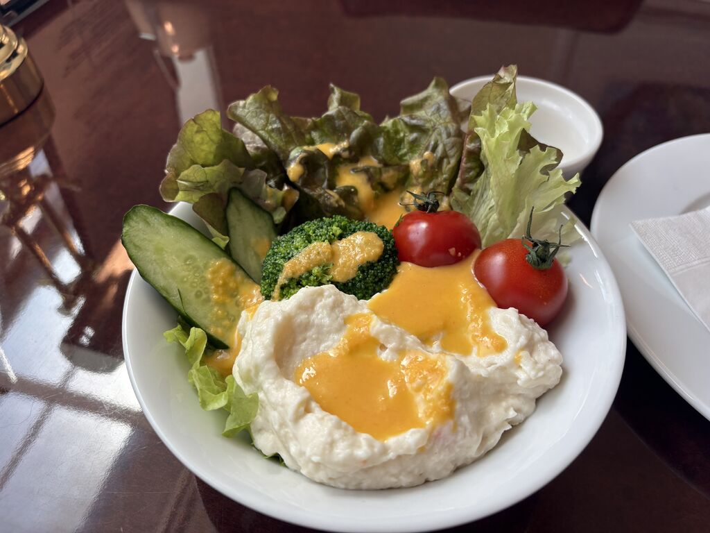 那須街道沿いの新しめの建物です。駐車場も広々です。建物後ろには那須連山が見えます。中に入ると広々とした店内で、通路には船の模型が飾らせています。ランチセットでボロネーゼを頼みました。そしてせっかくなのでケーキも頼みました。ケーキはフルーツタルトです。ランチセットにはサラダとドリンクがついてきます。サラダはポテトサラダがメインです。コーヒーはモカにしました。マイルドな味わいです。フルーツタルトは土台がチーズケーキです。とてもクリーミーです。のってるフルーツはベリー系でした。ものすごく落ち着いた店内でゆっくりできます。