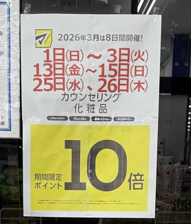 春のスタートダッシュSALEが始まったので、マツモトキヨシ宇都宮今泉店さんへ行ってきました♪「さらさ柔軟剤 詰替 超ジャンボサイズ」20円引きで本体価格1262円、「アタック泡スプレー除菌プラス詰替 大」30円引きで698円、「アリエールジェルボール プロ 本体11個」50円引きで298円、「ワイドハイターPRO 粉末 詰替用1300g」180円引きで1650円、「ファブリーズW除菌 詰替」20円引きで310円と、お得な商品がたくさん!、最近欠かせないコラーゲンドリンクも、「資生堂 ザ・コラーゲンLR ドリンク10本」が3980円で購入でき、大満足のお買い物になりました( *´艸`)SALE期間は特に品揃えも豊富で、つい色々と買いたくなってしまいます♪