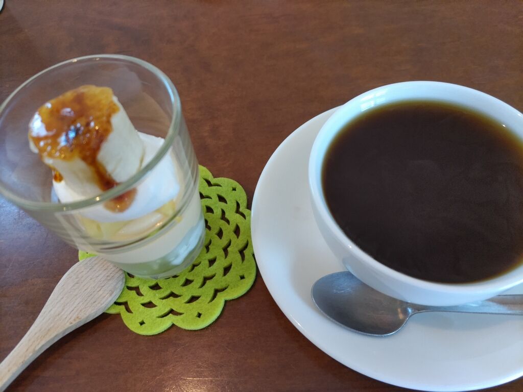 初めて伺うことが出来ました。宇都宮市役所の西側の道路に看板がありますが、アパート等もあって少し不安になってしまいました。ドアを開けるとカレーの良い香りがして食べたくなりましたが今回はお茶だけで我慢しました。【ブタンドセット(500円)】でオリジナルブレンドコーヒーとミニパフェにしました。ミニパフェはバナナ、カスタードクリーム、パイナップルが層になっています。バナナの上のキャラメリゼした部分がカリカリで、カスタードクリームもなめらかで美味しいです。ランチにはミニパフェがついているので、次回はランチの時間に利用したいです。