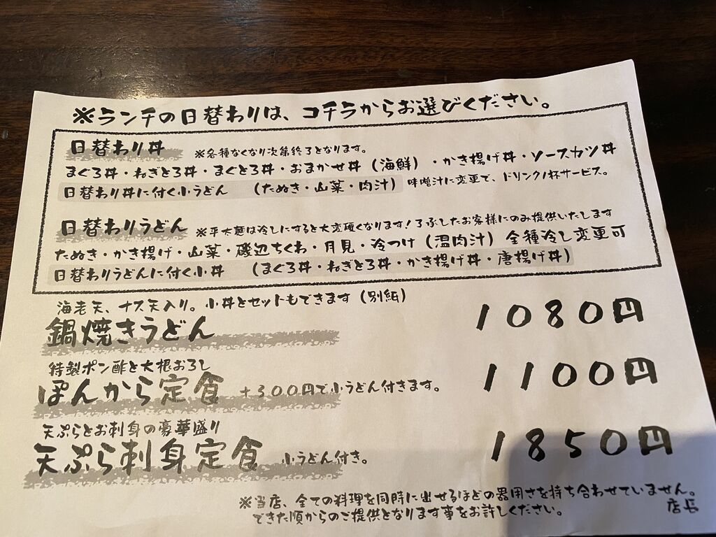 2人でランチ訪問しました。私は日替わりうどんの平打ち麺にかき揚げを選び、小丼はねぎとろ丼にしました。提供は早かったです。噛みごたえが有って美味しい平打ち麺に、別盛りで付いたかき揚げには上の部分に甘いタレが掛かっていたので、半分はうどんに投入し、タレが掛かった半分は、小丼のねぎとろのご飯の部分を半分残しかき揚げ丼にして頂きました。3種類の味を楽しみました。ねぎとろ丼はねぎとろが沢山乗って、小丼にしてはボリューム満点の極旨でした。食べたもの全て美味し大満足、満腹!ミニセットを良く頼んでいましたが、今回食べた日替わりうどんが気に入り、次はどれにしようかと今からワクワクしています。