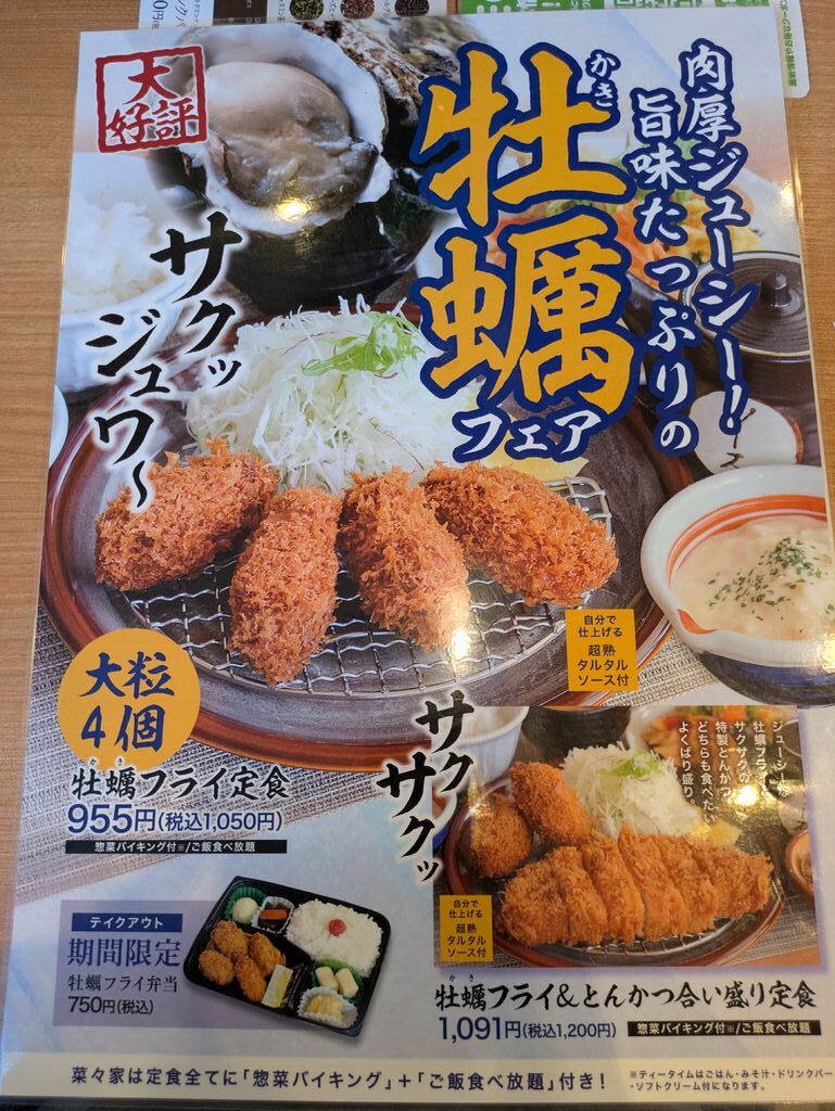 ジン蔵さん 宇都宮市 総合レベル103 ファン87 クチコミ 菜々家 鶴田店 宇都宮市/テイクアウト 129 42 今年もカキフライの季節がやってきました。菜々家のカキフライ定食は大粒のカキフライが4つも盛り付けられているので大好きです。サクッとジューシーな味わいでご飯がよく進みます。季節のご飯は生姜の炊き込みご飯でした。ピリッとした生姜の風味が爽やかで、生姜の体を温める効果もあり嬉しいご飯でした。バイキングコーナーでは、ひじきや高野豆腐、サラダなど体に優しい料理が多く、野菜不足解消にも一役買ってくれそうです。 訪問日:2026.02.22 クチコミタグ #ランチ #食べ放題 #盛り付け◎ #行列 #お1人さま #家族 #がっつり #おいしい #また来たい #限定 #サクサク "ぐッ"ときた! 12人 ジン蔵さんのクチコミ一覧に戻る