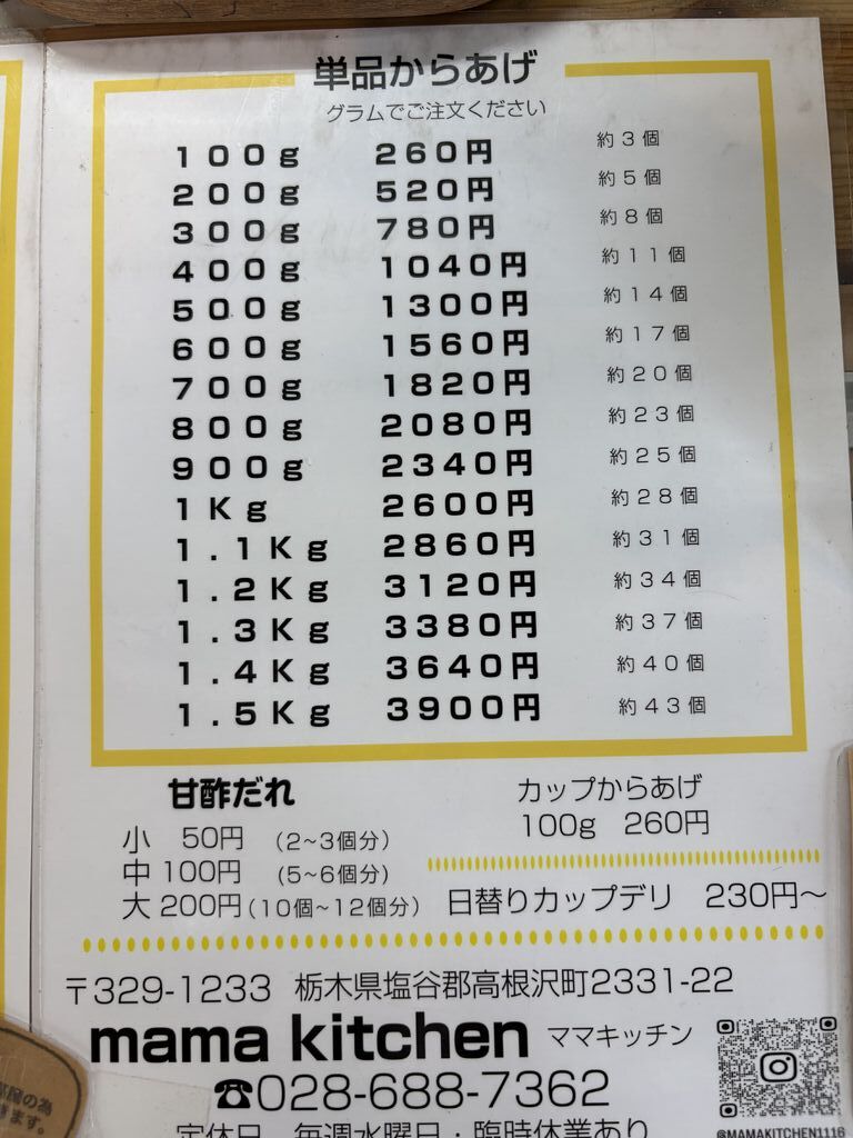 スリーフレンズさん 宇都宮市 総合レベル59 ファン18 クチコミ mama kitchen 高根沢町/からあげ 102 71 近くに出かける用があり、久しぶりに揚げたての唐揚げとお惣菜を買いました。お惣菜の種類が他では見ないものばかりで、毎回選ぶのが楽しいです。お店の方もいつも感じが良いので、また来たくなります。 訪問日:2025.10.02 クチコミタグ #テイクアウト #お1人さま #ご当地 #新鮮 "ぐッ"ときた! 15人 スリーフレンズさんのクチコミ一覧に戻る