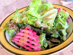 前回にパンを購入した時に店内に漂よっていたカレーのスパイシーな良い香り!。。。本日はカレーを食べに伺いました(*^^*)。。。オーダーは勿論【日光里特製スパイスカレー(サラダ・ピクルス付)大盛¥1300】(普通盛は¥1100)です(^o^)/。。。まずは新鮮でシャキシャキ感!ある野菜たっぷりのサラダ!ドレッシングも自家製だそうです(*´∀`)♪。。。目を引く網目にカットされた大根も美味しい!。。。一見何も入っていない風のルーですが、ジックリ丁寧に煮込まれた牛すじとテールがホロホロになり入っています(^o^)v。。。“スパイシー”と書かれてはいますが、コクが有りマイルドな食べやすい辛さです。しかし食べるほどに口内にスパイスの辛味が拡がりカレーの味わいと旨味を存分に楽しめます。また、別添えのスパイスで味変するのも楽しいですよ(^○^)。。。イートインメニューはカレーのみですが、ドリンクも色々と用意されていて購入した“パン”や“ケーキ”を店内で楽しむことも出来ます♪ヽ(´▽`)/。。。美味しいパン&ケーキにカレーが楽しめる素敵な『バルDE日光里』さん!お勧めです( ^-^)ノ∠※。.:*:・'°☆