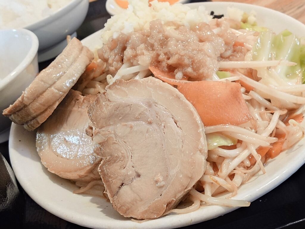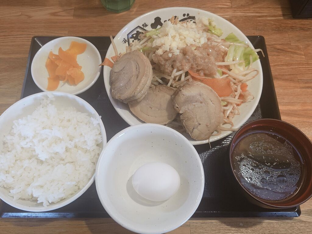 惜しまれつつ昨年9月に閉店された峰町の宇都宮本店さんには伺ったことは有るのですが…気になっていた「横田新町店」さんへは今回が初めての訪問です(^o^)v。。。こちらは店舗前に広い駐車場があり車は停めやすいです。まず自販機で食券を買い順番を待ちます。13時頃に伺いましたが、数名お待ちの方がいらっしゃりゃり人気の高さが伺えますねェ(*^^*)。。。今日は、【G系野菜炒め定食(味噌)野菜マシ¥1200】に【肉マシマシ(+¥400)】【ニンニクマシマシ(無料)】【アブラマシ(無料)】でオーダーしました(^o^)v。。。シャキシャキ食感の野菜に豚のうまみが凝縮されたスープとキレのあるかえし、ニンニンの香りが食欲をそそります(*´ω`*)。。。また、たまごは追加料金が必要なお店が多い中、生卵食べ放題はたまご好きには嬉しいサービスです♪ヽ(´▽`)/。。。定食の分量や味わいを自分好みにカスタマイズ出来て、嬉しいサービスが有る「野菜炒め専門店ベジ家 横田新町店」さん!美味しい野菜好きには堪らないお店です( ^-^)ノ∠※。.:*:・'°☆