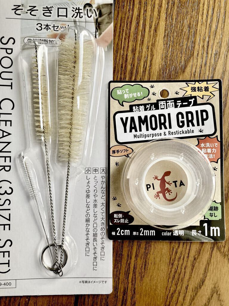 スタジアム内のSeriaさんで便利グッズを色々購入しました。「洗濯物が一度に外せるピンチハンガー」は針金ハンガーにピンチが10個付いた商品で、省スペースで小物を干すことが可能です。両端からピンチを押すと挟まっていた洗濯ものが一気に外れるので手間が省け時短になります。「ヤモリグリップ」は貼って剥がせる両面粘着ゲルテープです。ハサミで必要な分だけ切って、インテリアの底面に貼っておくと、地震時の転倒防止対策に、水回りの小物類の浮かせる収納にも便利です。机に貼って、ビニール袋をつければ簡易ゴミ袋にもなります。水洗いで粘着力が復活するので何度も使えます。吸水ヘアターバンは吸水性が高く、髪が早く乾くので毎日使っています。裏側ピタブラシは便器の縁までよく届き便利です。便利グッズ以外にもおしゃれな雑貨など沢山あるので楽しみながらお買い物が出来ます♪