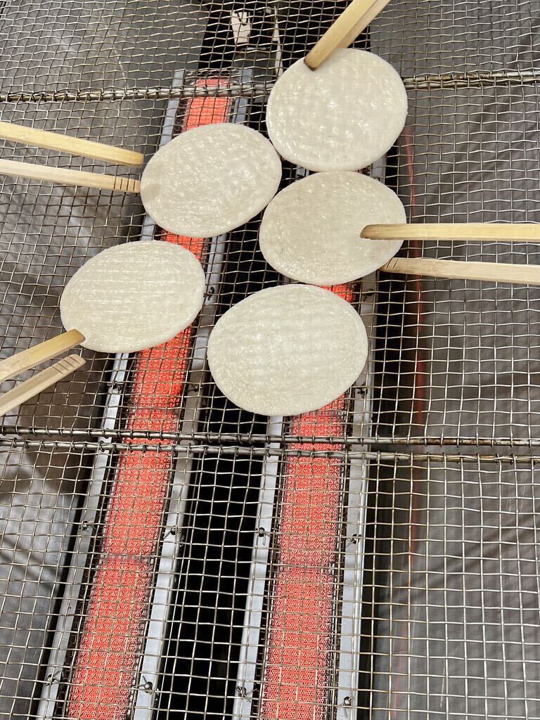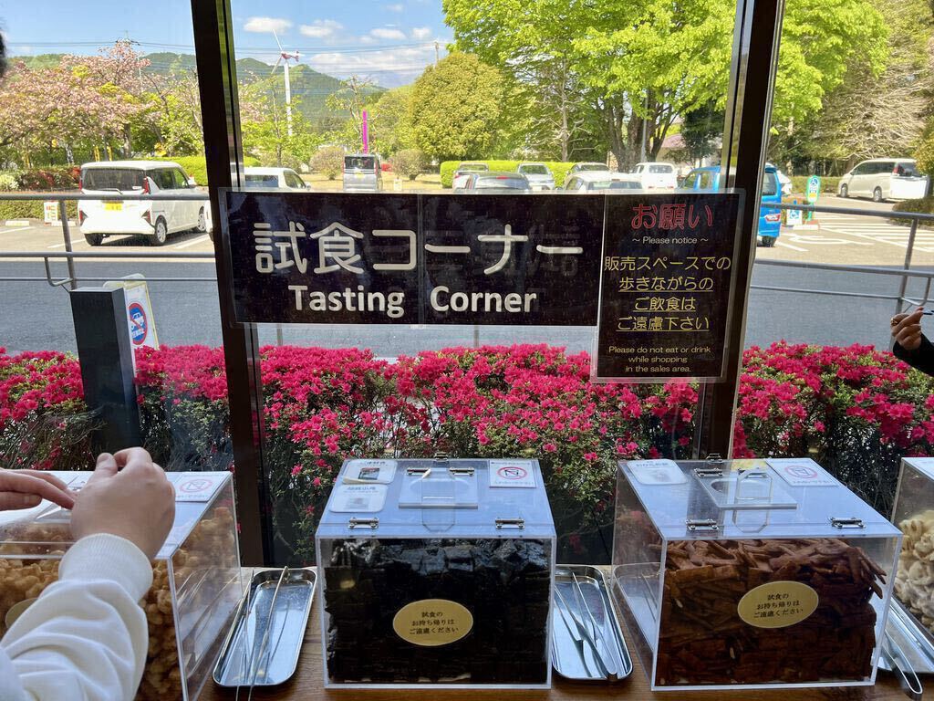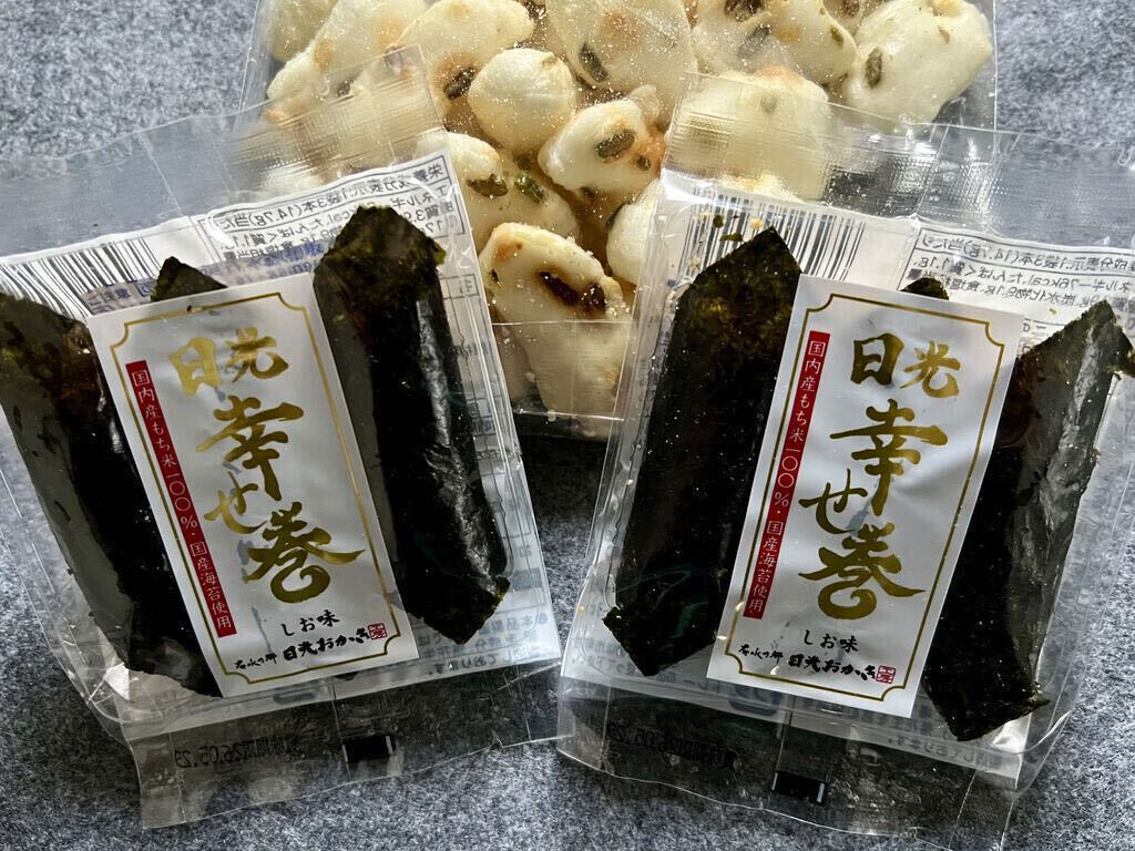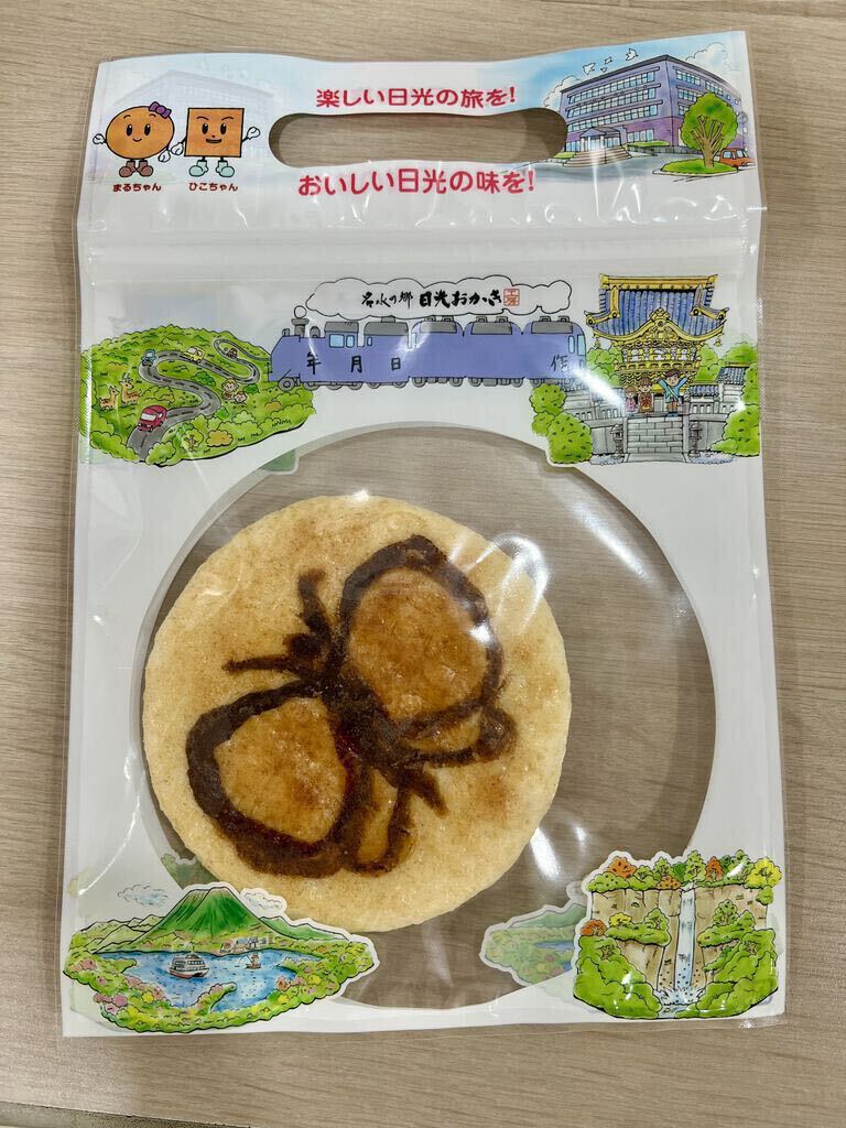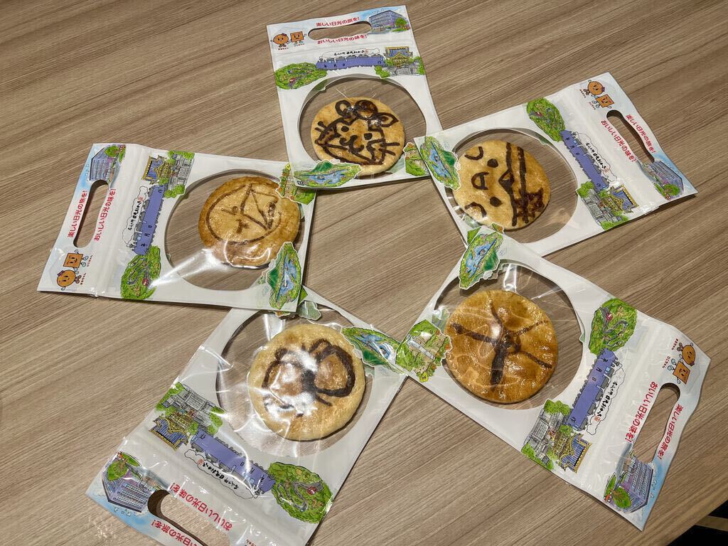 みんながやってみたいということで、『手焼き体験』(450円)を10:30から申し込みました。待ち時間の間、試食とお茶をいただきましたが、ここでいただく試食は、お土産を選ぶ参考になっていいですね。いざ体験の時間になり体験コーナーへ。みんなやる気満々!教えていただきながら、5つ数えて裏表返し、それを繰り返し両面程よい焼き色になった後、各々絵や字を描いたりして再び焼きあげ、出来上がり〜!楽しくいい体験ができました。最後にお土産選び、とってもお得な大袋の揚げたてアツアツの『揚げ餅』と、『こめジャガ(この日はカレー味)』(どちらも税込713円)は必須、その他自宅用には2袋でお得なものを、お遣い物には個包装になっているものを購入しました。川崎の『大師巻』という入手困難なおせんべいがあるのですが、似たような『日光幸せ巻』というおせんべいを見つけました。しお味を食べましたが(醤油味は品切れでした)、形状・味が似ていて美味しかったので購入しました。いろいろな種類の試食とお茶をごちそうさまでした。今どき、こんな太っ腹なサービスをしているところはなかなかないと思います!ありがとうございました。