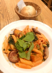 アフタヌーンティーさんにランチに伺いました!季節限定スパイシーチキンとほうれん草のトマトクリームペンネのパン付き、そして飲み物はディカフェのアールグレイ!スイーツも季節限定の栗とむらさき芋のショートケーキを別にオーダー!オーガニックトマトの優しいトマトクリームに、スパイシーチキンとほうれん草、かぼちゃ、レンコンが入って、とても美味しいペンネです!パンもいつもふわふわ美味しいです!栗とむらさき芋のショートケーキは、チョコスポンジに、むらさき芋とマロンクリームが両方使われていて、贅沢なとても美味しいケーキ!紅茶と食後をゆっくり楽しみました!テーブルには秋いろの可愛らしいお花、そして入り口のレジ近くには秋の焼き菓子、ギフト商品、カレー、パスタソース、紅茶等々素敵な商品が販売されていました!秋を満喫したランチ、とても美味しかったです!季節を感じられる素敵な時間を、いつもありがとうございます!ごちそうさまでした!