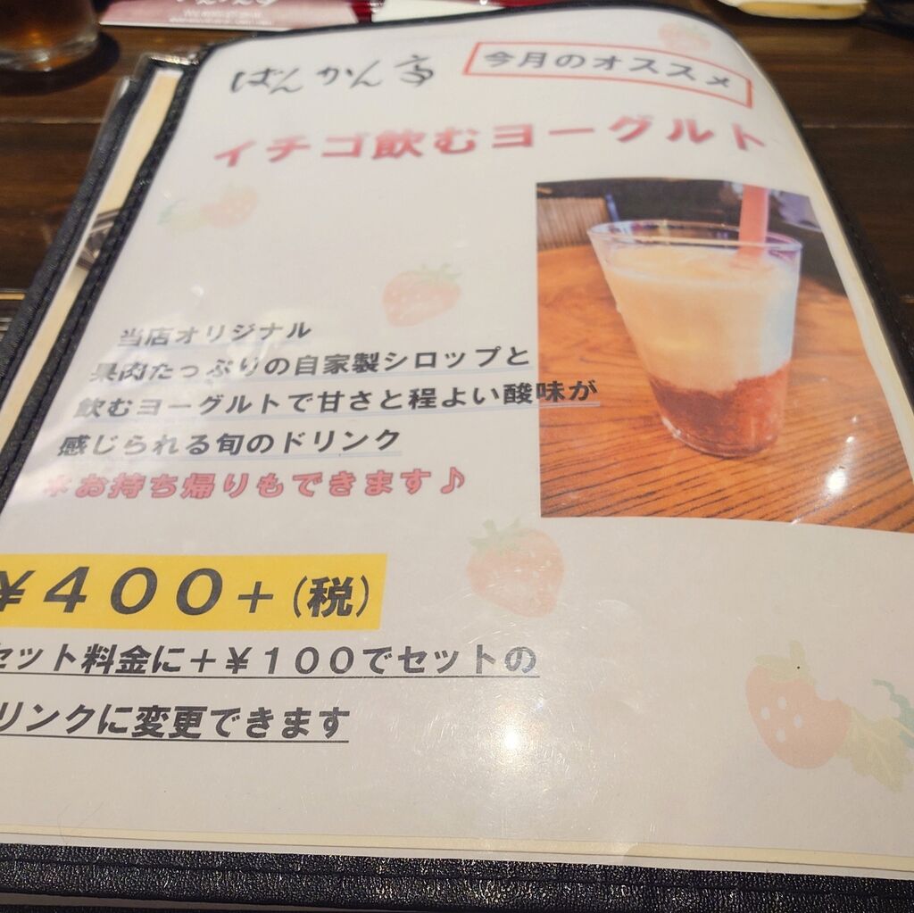 家族が大好きなばんかん亭さんに、また予約してディナーに伺いました!店内は満席で、人気が伺えます!家族が少しシェアしたいと言うので、とろとろハンバーグの300gの和風ソースを単品でオーダーしました!他に今月限定のイチゴ飲むヨーグルトをオーダー!とろとろジューシーの美味しいハンバーグはとても柔らかいです!デミグラスソースも選べます!イチゴ飲むヨーグルトは、イチゴジャムがたくさん入って、美味しかったです!メニューは期間限定も有ります!いちごのレアチーズケーキも美味しそうでした!その他メニュー豊富です!美味しいハンバーグ、ごちそうさまでした!ありがとう御座いました!ハンバーグ好きな方に、是非行って頂きたい、お勧めのばんかん亭さんです!