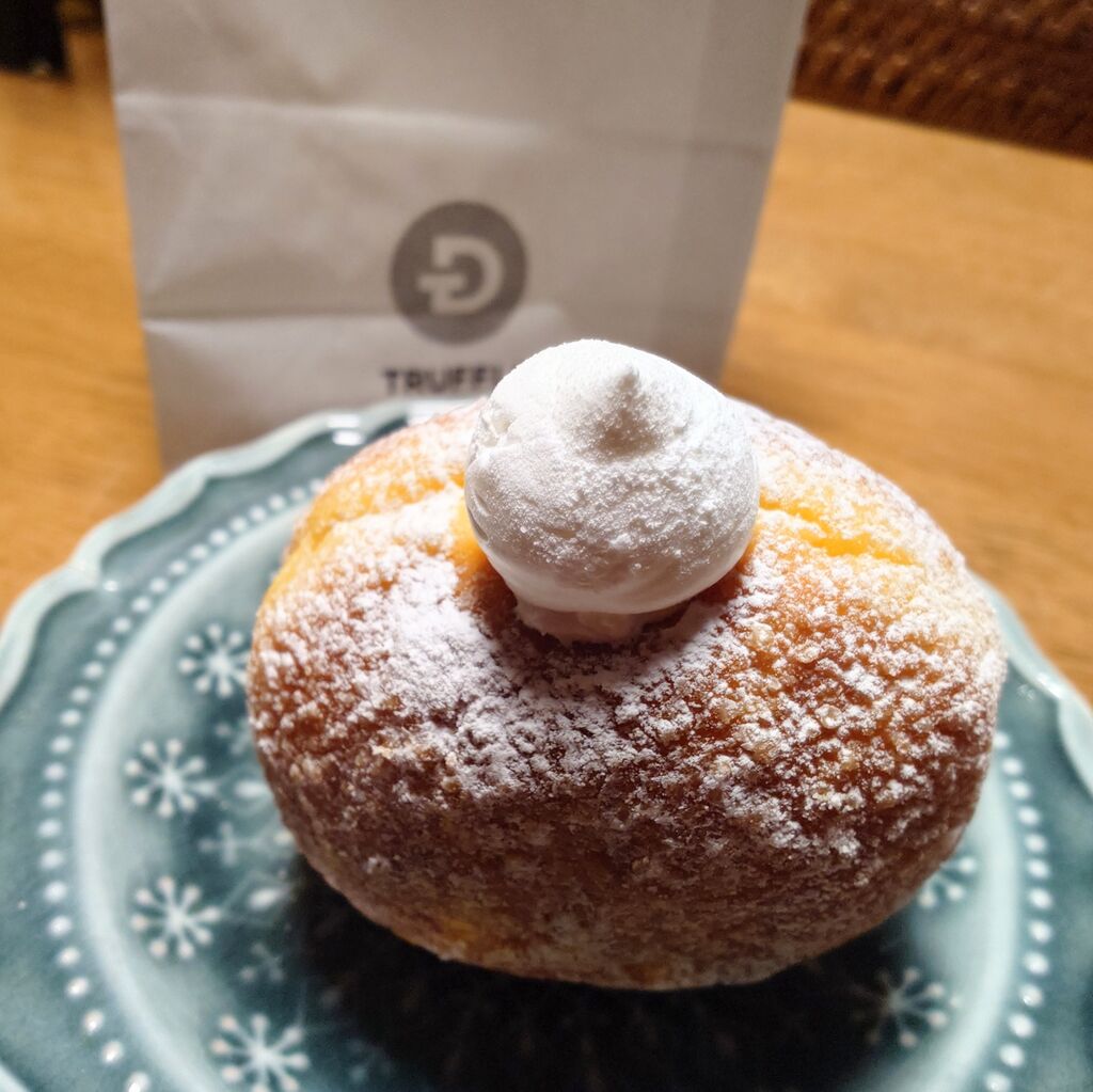 お気に入りのTRUFFLE DONUTさんに、また美味しいドーナツを求めて訪問しました!大人気なので夕方お伺いしたら、残り3個だけでした!妹と母と私で一つずつに分けました!私は生クリームの生ドーナツです!しっとりふわふわの生地に、たっぷりの生クリームがとても美味しかったです!季節限定の商品も出されています!トリュフドーナツは、その場で揚げて頂けるので、熱々で美味しいです!とても人気が有るので、早めの訪問をお勧めします!私も次回は早めに訪問して、色々な種類のドーナツをゲットしたいと思います!