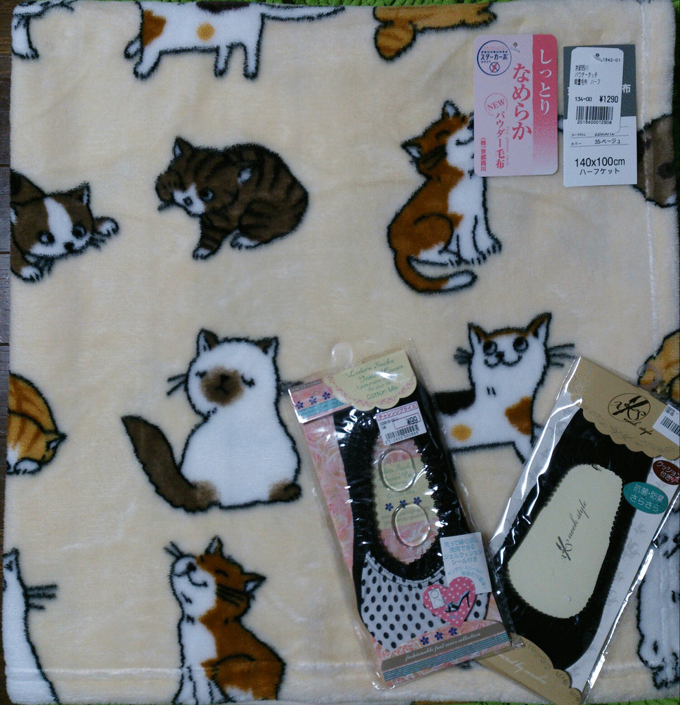 友達と一緒に、お邪魔しました。店内入ってすぐの売り場に、ハーフケット類が沢山並んでいました。すると、カワイイ猫柄のハーフケットを発見♪買い物に行った日は、天気が良く晴れていて暑い日でした。使うには早いので来月に購入しようとも考えたのですが、ハーフケットの猫柄は2枚しか置いてなくて…買いたい時が買い時だよねと友達と話していて、私は猫好きなので即Getしました。大手布団メーカーの西川だけあって、手触りは最高なハーフケットでした。しかし、価格はサンキ価格1290円とお買い得です。あと、ついでにパンプス用の靴下も購入しました。こちらも、サンキ価格の99円。お財布に優しいサンキ価格。本当に助かります。