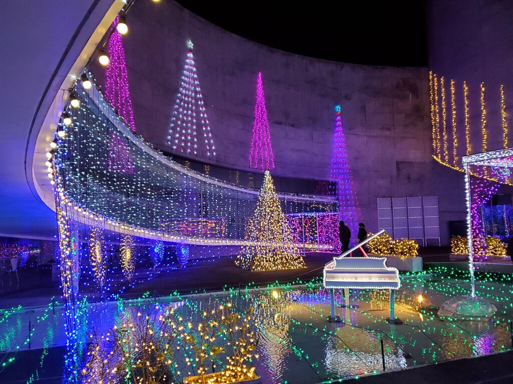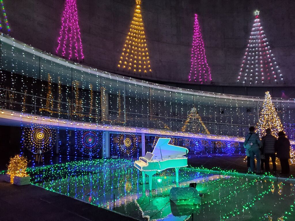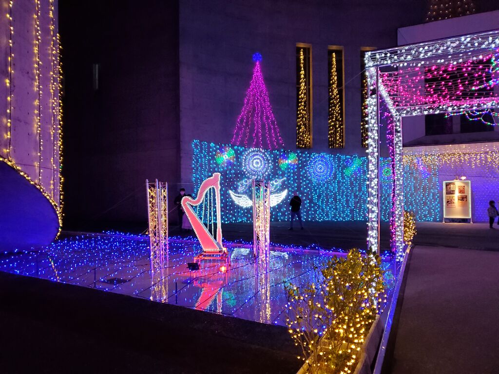 お久しぶりに復活したハーモニーホールの素敵なイルミネーション!!是非是非見たくて18時ごろお邪魔しました。混雑してるのかなぁと行ってみましたが、ちょうどご飯時なのか、比較的混雑もなく、じっくり楽しめました☆駐車場からトコトコ歩いていくと、キラキラ輝くイルミネーションが目の前に広がり始め、ワクワク感満載♪ハーモニーホールの名前のように、ピアノやハープが今にもメロディーを奏だしそうです。色も変わり見ていて飽きません。素敵なイルミネーションで寒さも吹っ飛びました^^