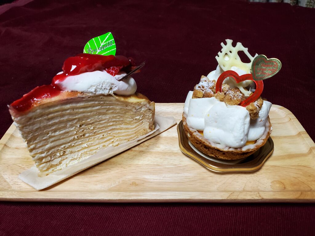 ものすごーくケーキがたくさん食べたい気分になり、17時半過ぎお邪魔しちゃいました。種類が充実しているのと、どれも美味しそうで悩んでしまいましたが『エルティー450円』『ミルクレープ470円』をチョイス。エルティーはレモンタルトにレモンクリームが乗ったタルトとのこと。レモン好きにはたまらないレモン尽くしのタルト。上部の生クリームのなかにはレモンの皮がたっぷり入っていて、コクのあるクリームにレモンの爽やかさが際立ちます。そしてタルトには酸味控えめのレモンカードがたっぷり☆レモンクリームとあわせると幸せなお味!!タルトの内側にはホワイトチョコのコーティング。細かな仕事が素晴らしい逸品です^^そしてミルクレープ、すごーく久しぶりに食べました。モチモチのクレープを何層にも重ね、その間にはコクのあるクリームがたっぷり♪甘くて幸せなお味ですが、苺ソースと果肉でキュッと締めてくれるので後味もスッキリ。いくらでも食べられそうです。美味しかった~!