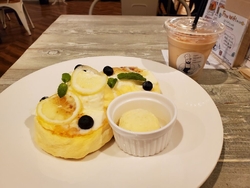 口コミを書いた際の返信で、期間限定の『レモンとレアチーズのパンケーキ1300円』を知り、レモン好きとしては絶対食べたい!!と早速お邪魔しちゃいました。7月からLoが19時になり、さらにお邪魔しやすくなったこちら。18時過ぎに到着し、無事オーダー。一緒に『チャイティー450円』も。あらかじめ焼き時間20分のアナウンスをしてくださるので助かります。ふわっふわのスフレパンケーキ、軽~い食感なので三枚あってもペロリ。空気たっぷりの甘さ控えめの生地に、レモンの酸味とレアチーズの爽やかなコクがプラスされたこちらは絶品過ぎ☆バニラアイスも添えてあり、アイスと絡めても美味しい^^チャイティーは今回アイスに。さっぱりした飲み口で火照った体もクールダウンでき、良いリフレッシュタイムになりました♪素敵な情報をありがとうございました。ぜひまた頂きにうかがいます。
