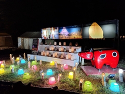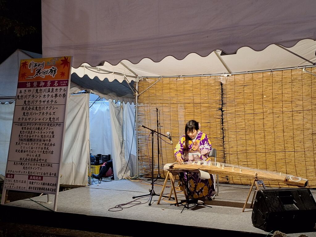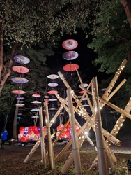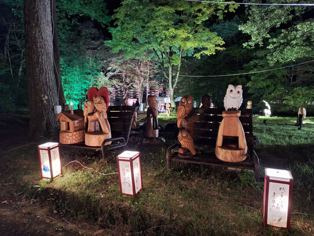 今年もまむたんさんの口コミを見てこちらの開催を知り、近々行こうと思いつつ…。ようやくお邪魔しました。19時半頃の到着で見ているかたはまばら。だいぶ気温も落ちていたのと、雨予報だからでしょうか。お陰で人を気にせずたっぷり堪能できラッキー!!毎年恒例の行灯型のライトには様々な方の絵が描かれており、一つ一つ見るのは本当に楽しい♪そこを抜けるとたくさんのフクロウさんの彫刻ゾーンに、キャンドルがたくさん。キュートなフクロウさんから、かっこいいフクロウさんまで様々で賑やかです。途中燃え尽きてしまった蝋燭を交換して回る少年に遭遇。一つ一つ丁寧に確認して、私たちが楽しめるように、安全に歩けるようにと作業されてる姿に心打たれました。そんななかメインの和傘のライトアップを拝見したので、例年以上にこのライトアップの素晴らしさと鬼怒川の皆さんの暖かいおもてなしの心に感動☆こんなに素晴らしいものに毎年出会えることに感謝でした!!鏡池に和傘や三日月の形をしたモチーフが反転して水面に写る姿が綺麗^^和傘を楽しんでいると、お琴の音色が。綺麗なお姉さんが玄を爪弾いて演奏する音色が、このライトアップにピッタリで、うっとり。会津とコラボということもあり、荒城の月の演奏や、もののけ姫などピッタリドハマりな演奏。タイミングよく来られてラッキー!帰りには会津の名産品などが販売、最近ハマっているあかべこさんのコインケースをゲット。可愛すぎて何をいれて持ち歩こうかワクワクです。こちらの公園でのライトアップは9日までだったようで、現地についてそれを知り、本当にタイミングが良かったなぁとひと安心。撮った写真を栃木県内外のお友だちに送信したら、なんで教えてくれなかったの?行きたかった!!と皆から責められました。ぽぽ♪さんの昼間の投稿も拝見し、昼間も見たくなりました。来年の開催も楽しみです。