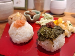 お昼ごはんを食べ損ねたこの日。さすがにお腹もすいてきて17時前でも美味しいランチがあるこちらにお邪魔しちゃいました。当日のメニューは金目の煮付けと『おむすびセット950円』。魚介はあまり得意ではないので、おむすびをチョイス。デザートつきのセットにしようか悩みましたが、カウンターに記載のあった『フルーツパフェ750円』に目がいきこちらをチョイス。ハーブソルトがかかったサラダはあっさりしていていくらでも頂けちゃいそうな美味しさ^^具だくさんのスープにはキノコや根菜がたくさんで、食べるスープそのもの。真ん丸おむすびは梅/明太子/おかかチーズの三種。ポテサラ/ニラの天ぷら/ズイキの副菜もついていてたっぷりランチです。明太子あまり得意ではありませんでしたが、こちらのは生臭くなく美味しく頂けちゃいました。おかかチーズもすごく美味しく、特に自家製漬け込みのシソの葉を巻いた梅はとにかく絶品☆お持ち帰りしたいくらいでした。食後のパフェには今が旬の無花果や柿なども乗っていて、フルーツたっぷりの贅沢なパフェ。食べ進めるとフルーツソースのようなジャムが入っていて食べ飽きることがない逸品♪カフェタイムに魅力的なデザートが登場ですね。今回も美味しく大満足。ごちそうさまでした。