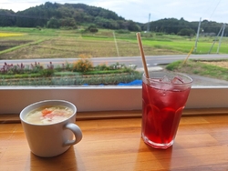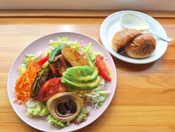皆さんの口コミを拝見していて、いつか行ってみたいと思っていたこちら。オープンと同時の11時に到着するも、駐車スペースはほぼ満車。すれすれ停められました。ジビエバーガーがとても気になりましたが『畑の彩りサラダプレート(レギュラー)1200円』『セットドリンク(クランベリージュース)300円』をチョイス。最初にスープとドリンク登場。玉子とトマトのスープで、とても美味しく玉子たっぷり^^これはすごーく期待大‼と思っているとパンとサラダがどーんと登場。彩りというだけあって、たくさんの種類のお野菜が、生、グリル、素揚げ、デリと様々な調理方法で大集合。お野菜のお味も濃厚で、熱の通ったものは甘味が強く、生はシャキシャキ新鮮そのもの。何て贅沢な一皿なんでしょう☆もう美味しくてペロリでした。全てお野菜だけですがモリモリな量なので大満足‼パンはほんのり塩気とオリーブオイルが付いていて、ふわっふわで美味しく、サラダととてもよい相性♪ボリューミーで大満足なランチを堪能させていただきました。周りの方はチキンオーバーライスのオーダーが多く、早々に完売してしまうほど。そちらもすごく気になるので是非ともまたお邪魔して頂いてみたいです‼