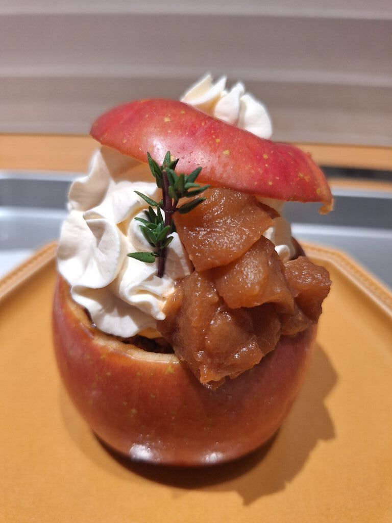 以前SNSで拝見していた『丸ごとりんご1273円』がずーっと気になっており18時前にダメもとでうかがってみたところ、ショーケースにどーんと鎮座‼本当にまるごとリンゴで、食べられるかしら?と不安になりつつ、『オーガニックアールグレイ550円』と共にオーダー。トレイに乗ったリンゴはずっしり重く、リンゴの爽やかな香りが際立ちテンションアップ。まずは蓋の部分をパクッ。うん、リンゴ。そこについていたクリームは生クリームだろうと思いきや、キャラメル生クリーム‼何とも芸が細かく、リンゴに合う‼その下には火を加えたリンゴにクランブルとカスタードクリーム、スポンジと外からはわからない様々な美味しさが詰まった魅惑のリンゴでした☆もちろん美味しいので、食べきれるか何て心配はなく、ペロリと完食^^紅茶ともすごーく相性がよく、リンゴもお茶も香りとお味とバランスよく、素敵な読書タイムを満喫することができました♪今こちらのショーケースはクリスマススイーツで溢れており、見た目も素敵でした!