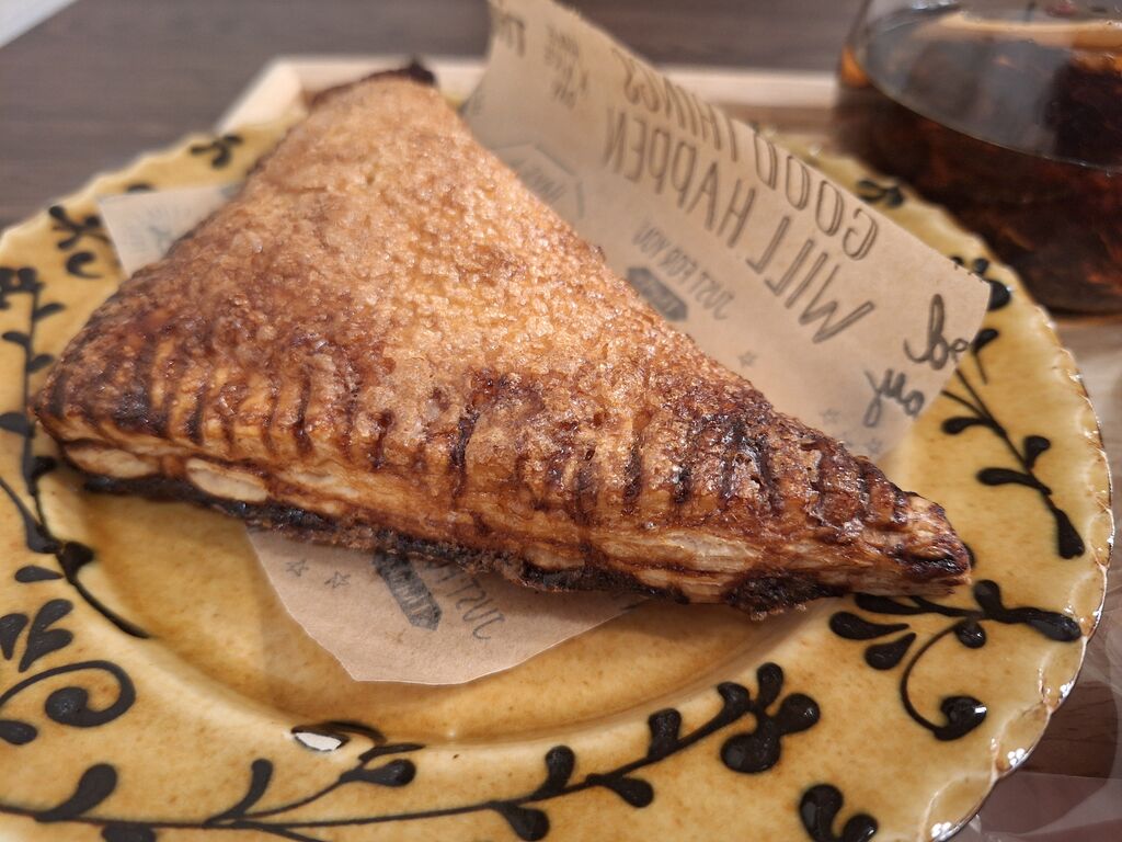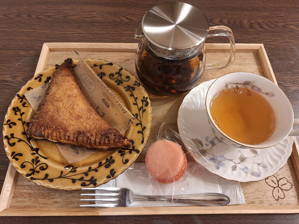 ずっと気になっていた洋菓子喫茶シロツメさんの『アップルパイ700円』、実食させていただきました‼この日は17時過ぎにお邪魔したものの、ケーキが3種とも残っており(どれも在庫わずか)、どれも魅力的で悩みまくりでした。普段お見かけしない『マカロンラズベリー300円』と、『紅茶(エスプリドノエル)600円』でオーダー。オープン時間にあわせて焼き上げるというアップルパイ。パイ生地も店主さんの手折りで時間がたっても焼きたてのようなサクサクパイ。中のリンゴもちょうど良い食感とお味で美味しい‼手でもってガブッとモグモグ。手が離せず一気にペロリしてしまう危険な美味しさでした☆合わせた紅茶、マリアージュフレールのエスプリドノエル。いわゆるスパイスティーで、店主さんがアップルパイとマカロンと合うとチョイスしてくださいましたが、その通り絶品♪シナモンやアップルなどのフルーティーで香りの良いスパイスティーに魅了され、翌日渋谷でゲットしてしまいました‼こちらのお店、おやつも美味しいですが、お茶好きの店主さんがチョイスしたくださるお茶もすごーく魅力的‼マカロンもボリューミーで美味しく大満足でした^^サービスで頂いた金柑煮のお湯割りも美味しくて、テイクアウトしなかったことを後悔中です。こちらの店舗は一見普通のお宅ですが、玄関でオーダーとお会計をすませ、広々お2階でゆったり喫茶を楽しむスタイル。静かでゆったり本を読みつつ喫茶を楽しめるお気に入りです。