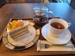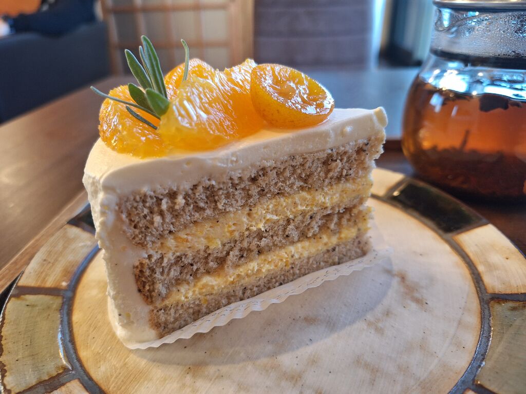 大好きな洋菓子喫茶シロツメさんに再び参戦‼お昼前に拝見したSNSで『きんかんショート750円』が連休限定とあり、絶対食べたい‼と思い14時前にお電話してお取り置きをお願いしました。この時点ですでにラスイチだったようで、無事ゲットできてひと安心。17時前にお邪魔し、『紅茶650円(ハニーハーヴェスト)』をチョイス。こちらの店舗は美味しいお茶が種類豊富。店主さんが新しいお茶を仕入れしてきたばかりのようであれもこれもとおすすめがあるくらい‼はちみつの香りと様々なフルーツ系のお味がマッチしたハニーハーヴェストはお茶自体とても美味しくこれだけで満足しちゃうお味♪そこにアールグレイが加えられたスポンジ生地に、金柑や柑橘類のムースがサンドされたきんかんショート、美味しくないわけがない☆紅茶との相性も最高で、美味しすぎで一気食いを防止するため、一口一口噛み締めつつ、フォークを置いて…と普段と違う食べた方で満喫‼このケーキ美味しすぎです。店主さんのケーキに対する妥協を許さないスタイルと、美味しいお茶と共に楽しんでほしいという心意気に溢れたお店様です^^