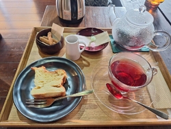 美味しいお茶とお菓子を楽しみつつ本を読める素敵空間に‼と15時過ぎにお邪魔しました。駐車スペースにはたくさんの車、満席かも~と扉を開けるとほぼ満席状態。ですが数席空いておりセーフ‼と意気込み『デザートとドリンクセットポットサービス(林檎ハニーミルフィーユ/美養茶紅)1510円(現金価格)』をレジにてオーダー&お会計。現金払いだと2%OFFになるのはとっても嬉しい‼こちらのスイーツは行く度に変わるので何に出会えるのか楽しみ。今回のハニーミルフィーユ、しっと~りとした生地に薄くスライスされた林檎が積み重なって焼き混まれており、まさしくミルフィーユ‼林檎の爽やかさがあと引くうまさで夢中になってしまいます☆あわせたドリンクは、ローズヒップやハイビスカスがブレンドされたお茶で、酸味がありとても飲みやすく美味しい♪読書のお供にと思っていたので、ポットで提供いただき、たっぷり堪能。お湯のおかわりもいただけて、すっかり長居してしまいました。居心地良く心休まる素敵な時間を過ごさせてもらい感謝です^^