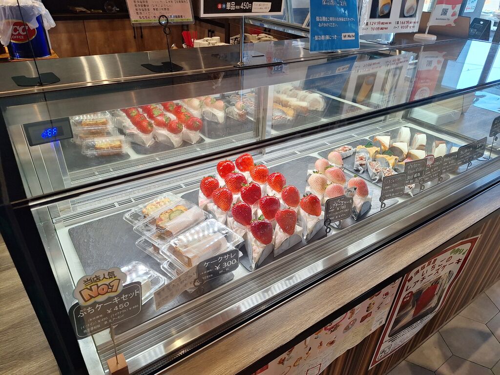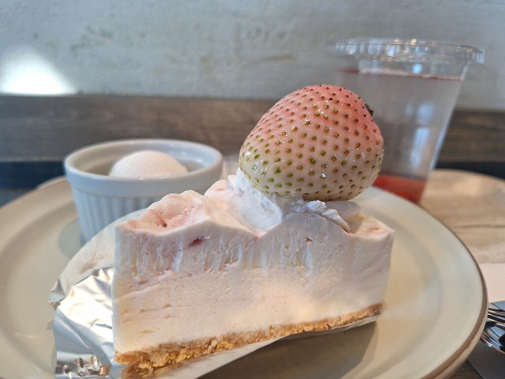 美味しい地産地消の野菜や果物を使ったスイーツが楽しめるこちら。久しぶりにお邪魔しました!14時半過ぎの訪問で美味しそうなケーキがズラリ。なかでも『苺のレアチーズケーキ(白)780円(外税)』は大きすぎる苺がどーんと乗った迫力満点のケーキ。赤と白があり白をチョイス。選ぶことはできませんが、多少苺にも大きさのバラつきがあり、私のところに来てくれたのはこれでも小さめのヤツ。甘味が濃縮されていてとっても美味しかったです☆が、苺がとにかく大きいのでフォークでズブリとやっても重っ‼と言ってしまうほど。テイクアウトも出来るので、皆さん「こんな大きい苺が乗ったケーキ、お土産にしたら喜ぶよね~^^」と買われる方も多く、あっという間に完売間近になってしまうくらい大人気でした!タイミング良かった~。『梅スカッシュ450円(外税)』もイートインしましたが、ほどよい酸味と優しい甘味で疲れも吹き飛ぶ美味しさ♪普段甘いおやつには甘くない飲み物をチョイスしますが、これは美味しいのでついつい我慢できずチョイスしてしまいます。平日限定のベジデリセットも気になる限り。いつか食べてみたい‼