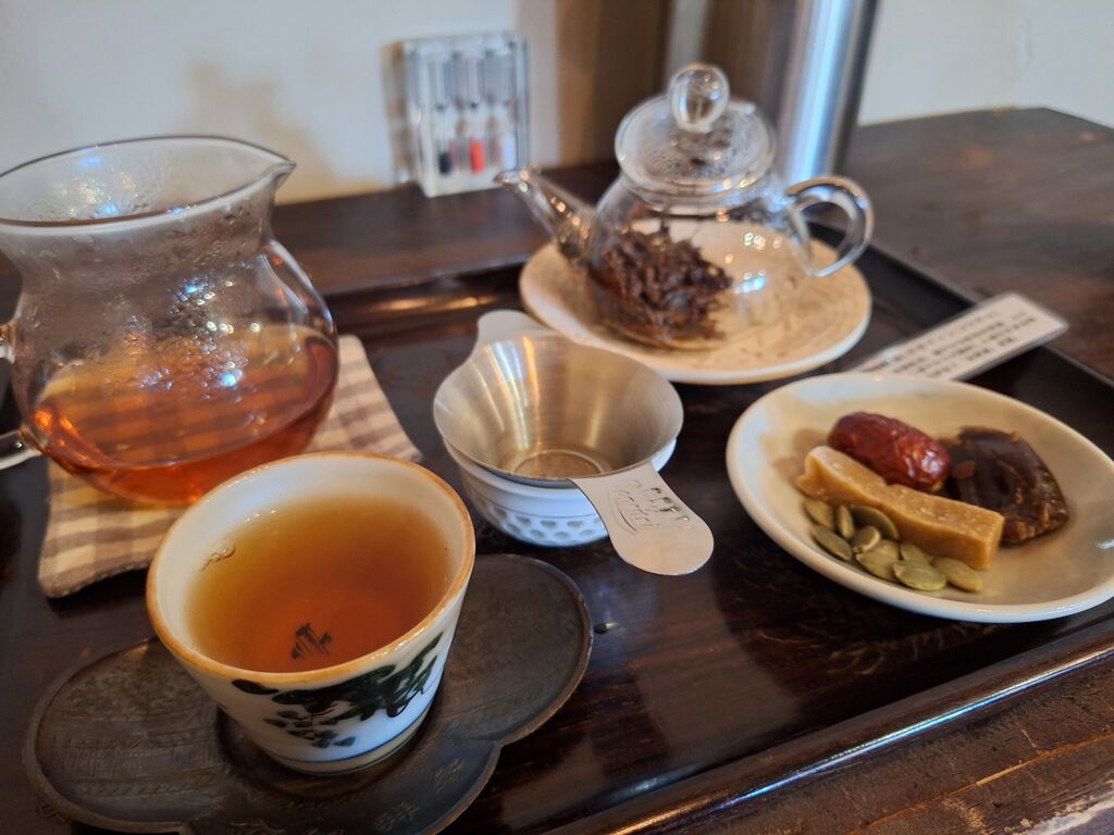先月お邪魔してすっかり虜になってしまったテレンコさん。どうしても再訪したくて14時半頃お邪魔しました。平日のため混雑なく、気になっていた隅っこの席へ。烏龍茶も美味しいけど、今日は中国茶紅茶の気分、解説で気になった『桃映紅茶850円』に、『チョコバナナケーキ400円』をチョイス。解説通りスパイシーな香りに爽やかな後味の紅茶。辛いわけではなく、良い香りの余韻に浸れ、イギリス紅茶とは異なる味わいにすっかり魅了され、煎も効くことからながーくたっぷり楽しませていただきました☆グルテンフリーなこちらのお店、チョコバナナケーキも例外ではなく、しっかりそば粉のお味を楽しめつつ、ちゃんとチョコバナナの美味しさが満喫出来るウマウマなケーキにゾッコン♪クリームかと思いきや、ヨーグルトのようなほんのり酸味のある爽やかなクリームが添えられ、そちらも絶品でした‼お会計時に、以前より気になっていた『山椒ホワイト(ミニサイズ)100円』のクッキーを発見!ミニサイズで可愛い。テイクアウトし、帰宅後いただきましたが、山椒の痺れとホワイトチョコの甘さがマッチした大人のクッキーに新たな扉を開いた気分^^今回も居心地良く、大満足な滞在。店主さんも覚えててくださり嬉しい限り。是非是非通いたい素敵なお店様です。