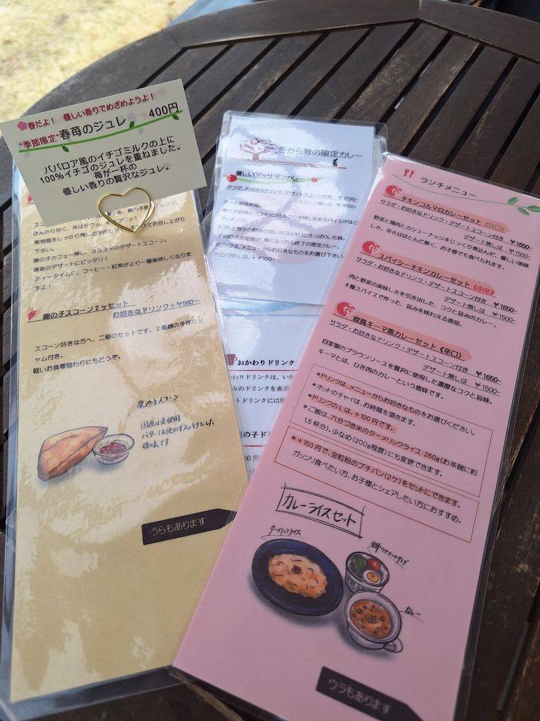 鹿の子さんの美味しいカレーが食べたい‼と思い、14時頃お邪魔しました。ピーク後のようですんなり着席。6個限定の春苺のジュレや、パンとカレーのランチは完売に。ですがちゃんとランチは残っててくれて『スパイシーチキンカレーセット(デザート無し/ご飯少なめ)1500円』をチョイス。辛いのが苦手ではありますが、こちらのチキンカレーももちろんしっかり辛く(辛いのが平気な方には辛くないと思います)、たっぷり毛穴から汗が出てしまい、デトックス出来ちゃうイメージですが、それでも食べたい美味しいカレー☆辛みよりも旨味があり、辛いのになぜか優しい旨味が感じられる愛情たっぷりカレーにぞっこんです。添えてあるサラダもどの食材も一手間加えられていて美味しいので終始大満足‼食後に頂くチャイもお気に入りのひとつ。疲れた日に食べてからだの中からしっかり癒されたい人におすすめのお店様です。