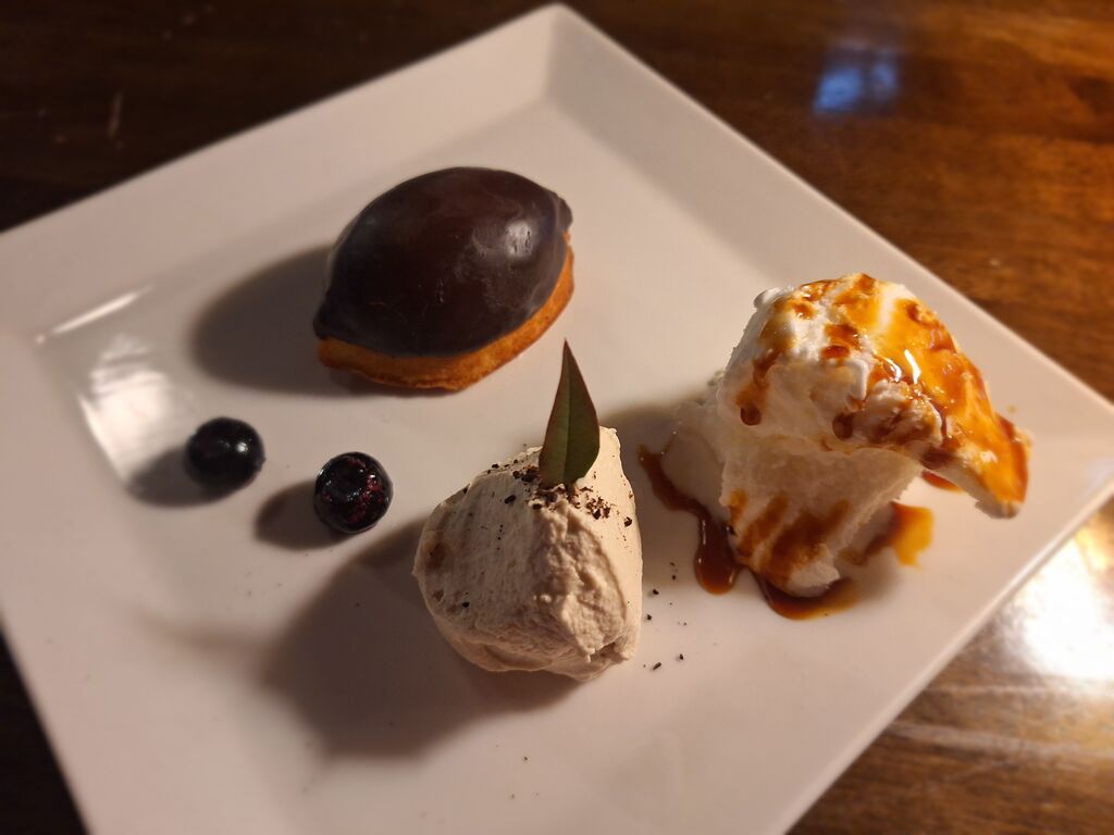 知人へのギフトにと『日光珈琲ドリップパックアソート1188円』をゲットするべく17時前にお邪魔しました。お店に入る前はカフェ利用の予定はなく、アソートのみのゲット予定でしたが、良い香りに誘われて、気付けばお席にストン。『ケーキセット1430円(カフェ・オーレ/コーヒービーンズケーキ)』をオーダーです。お初のコーヒービーンズケーキ、見た目から珈琲豆を連想させますね。ふんわりな生地のケーキにチョコと珈琲のお味がマッチ♪添えてある珈琲ベースの生クリームや、バニラアイスと合わせても美味しい。カフェオーレは生クリームがオン。飲みやすいお味の珈琲が生クリームでさらに美味しく飲みやすく、マイルドな口当たり☆いつもは紅茶ばかりでしたが、カフェオーレ、ハマりそう‼雨降るなか、のんびりとした時間を過ごさせていただきました^^