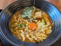 平日の開店直後に伺ったので待たずに入れました。『焼きチーズカレーうどん』を注文。のびのびチーズ、ネギ、揚げ餅とお揚げ、豚肉が入っていて食感が楽しく、うどんは中太?麺でもちもちです。カレーは蕎麦屋にあるような甘めの味付けではなく、あっさりとした味わいながらコクがあり食べ進むとちょい辛かな?という印象です。お連れ様が選んだ『しっぽくうどん』は出汁が効いていて、甘くなくさっぱりとした味です。お麩やきつねも味付けされており、一品一品丁寧に調理されている印象を受けました。乗っている梅干しが良い仕事をしていて、後半にはお出汁に梅干しの酸味が溶け込んで違った味わいを楽しめました。もつ煮をテイクアウトしましたが、これがまたトロトロで柔らかく、塩味がしみしみでツマミにもおかずにもなりました。別のメニューも食べたいのでまた伺います。