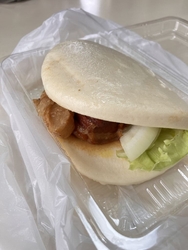 山あげ会館前で開催されていた「メグロ・キャノンボール那須烏山」に出店されていました。今回も美味しそうな香りに食欲が刺激され、我慢できずに早い時間に購入しました。「豚角煮割パン500円」です。ふかふかの蒸しパンの間に、レタスとたまねぎ、高菜漬けとともに、とろっと煮込まれた豚角煮がゴロンと挟まれています。やわらかな角煮と高菜漬けの相性は抜群で、ふかふかの蒸しパンと一緒に食べれば、思わず笑顔になっちゃいます。今回はお腹の容量の問題でいただけませんでしたが、牛筋煮込みや小籠包もめっちゃ美味しいんです。次回の出店の際にいただきたいと思います。美味しい幸せをありがとうございました。ごちそうさまでした~。